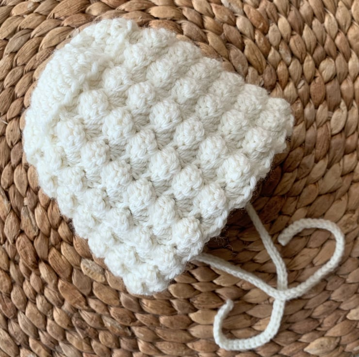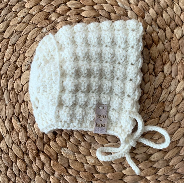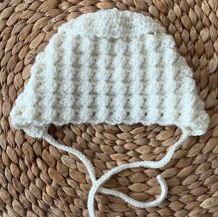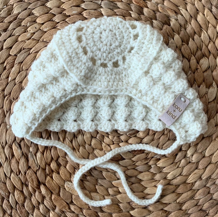 Simply gorgeous baby bonnet hand crocheted by me in 100% Merino Wool in Off White. Merino Wool is super soft, perfect for delicate baby skin, and is a breathable natural fibre.