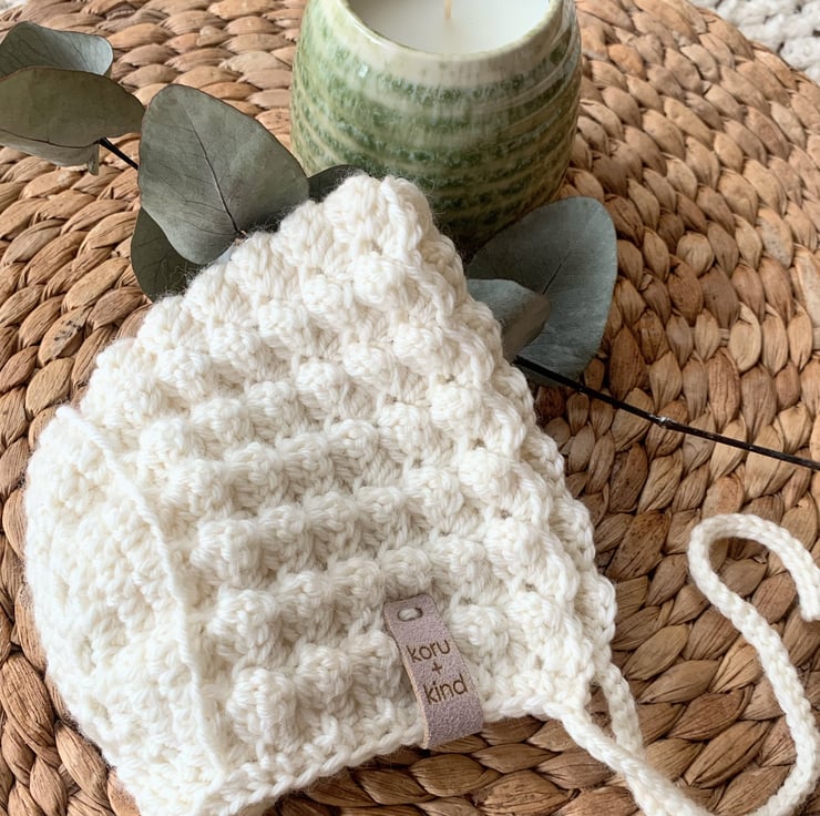 The Bridgerton Bonnet is a traditional heirloom piece, with a shell stitch texture and a wavy edge to frame the face. Bonnet depth is approx 15cm. To fit approx 0-3m.