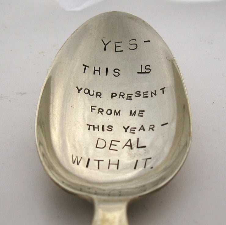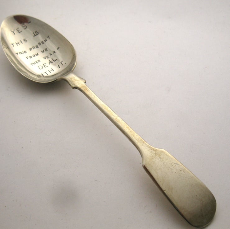 A handstamped vintage nickel silver dessertspoon that says YES. THIS IS YOUR PRESENT FROM ME THIS YEAR. DEAL WITH IT. It's a battered but serviceable spoon with a 'fiddle pattern' handle, measuring approximately 18cm long. A great joke present for winding up an entitled teenager or getting back at someone who always says their presents are rubbish! (Whether or not you then give them anything else is up to you!)