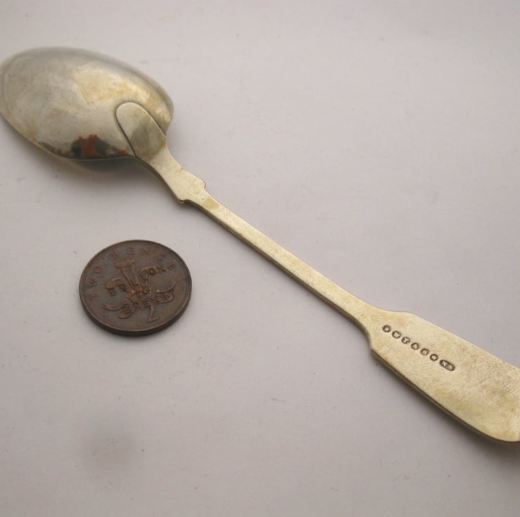 Please note this is a vintage metal alloy spoon (likely 1930s-1940s) so it has scratches, dings, tarnish and wear marks in accordance with its age. And it won't polish to a nice 'white' silver colour like a plated spoon, it'll always have that slightly brassy tone. If you were looking for a mirror-finished brand new spoon, this isn't one. But then that is kind of the point... and it is in the bargain bin...