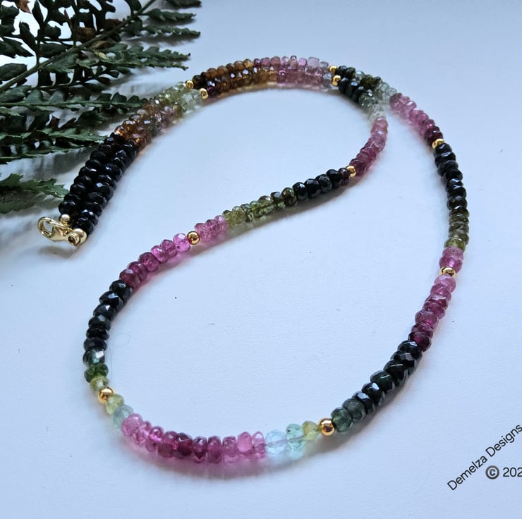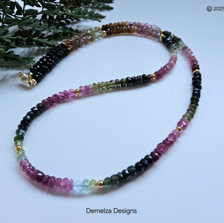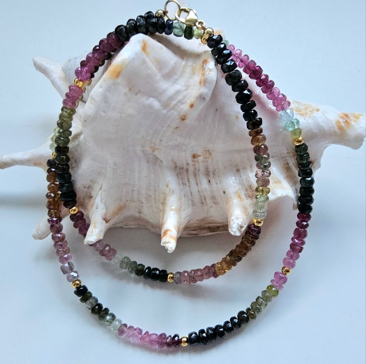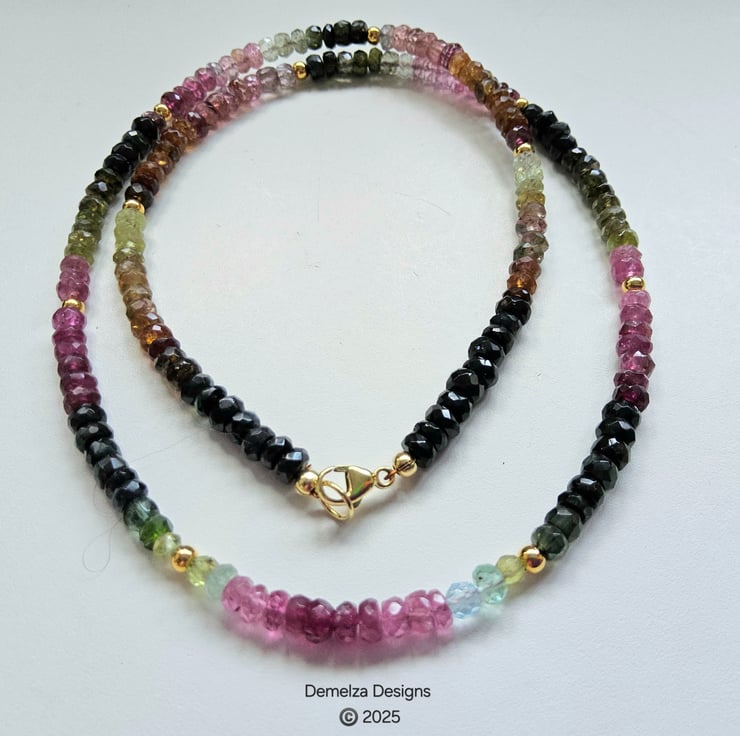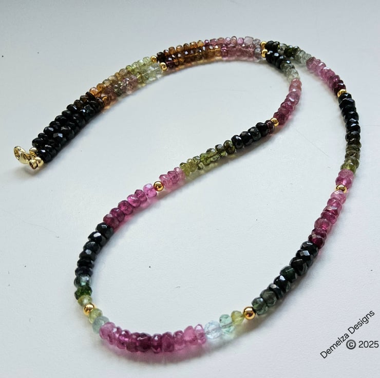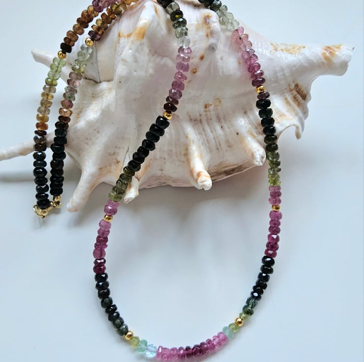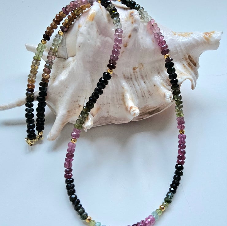 This attractive feminine necklace will be an ideal gift for ladies whom value and appreciate the beauty of genuine gemstone jewellery to wear on a daily bases. Tourmaline is expensive to purchase in boutique jewellers. In a Truro crystals jewellery shop a simple tourmaline rondelle necklace was priced over £1200.00.