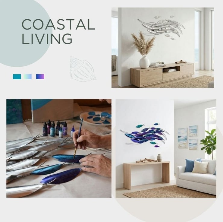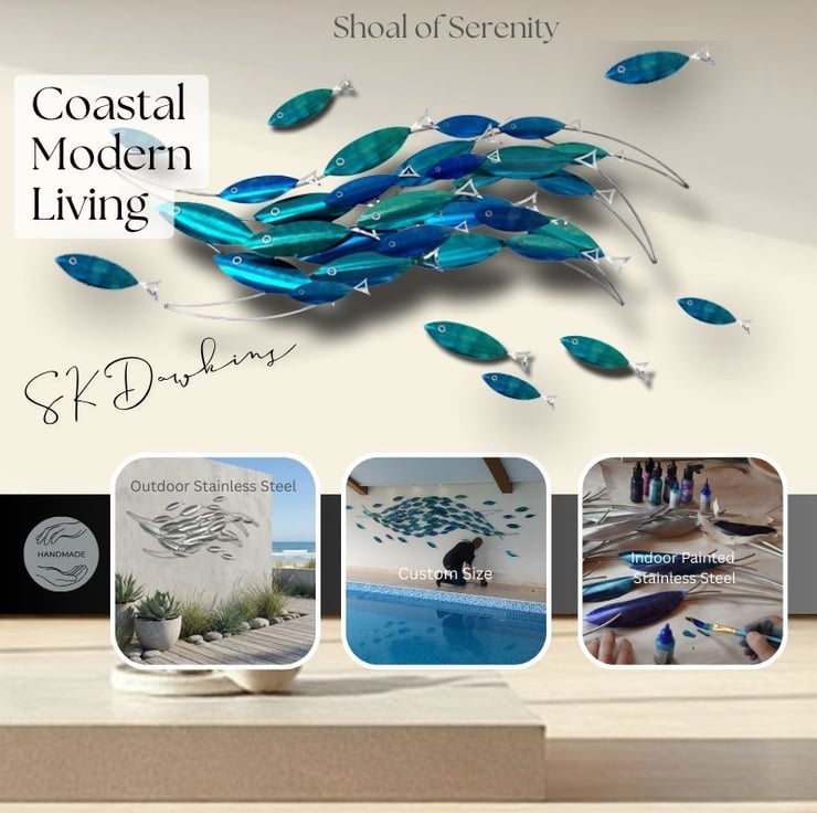 This school of fish sculpture began as a sketch inspired by a walk along the coast, watching silvery shoals dart through the shallows. In my workshop, I chose stainless steel for its shimmer and resilience, Ive tried capture the movement of the ocean. The blue and teal finishes were layered to reflect sunlight, just like water glinting on the surface. Carefully, I welded each fish and arranged them to form a lively shoal, always imagining how they’d bring a sense of calm and coastal beauty to someone’s home. Every piece is made with care, hoping it brings the spirit of the sea indoors.