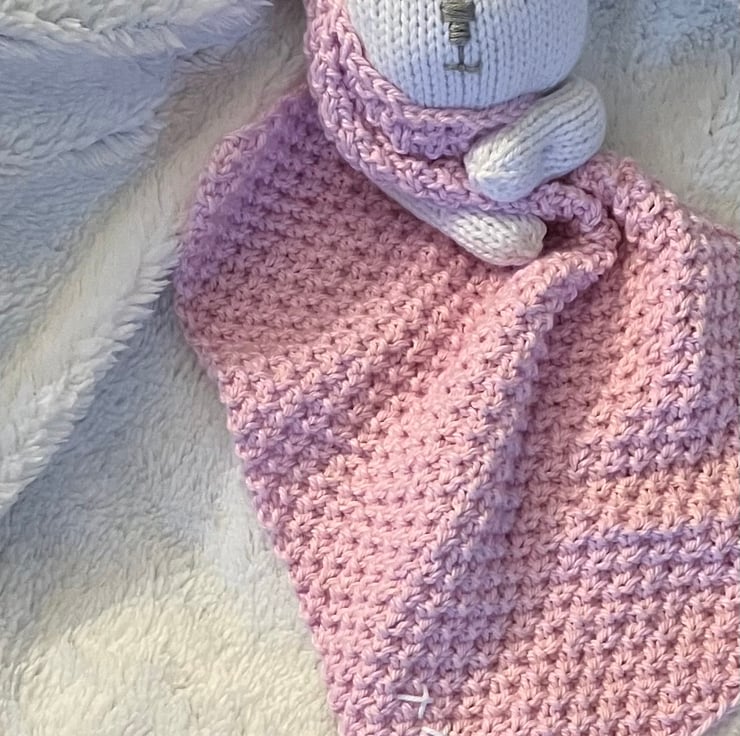 It has been knitted using a pure, super soft white cotton yarn, the same quality yarn has also been used for the pale pink blanket adorned with little embroidered kisses.