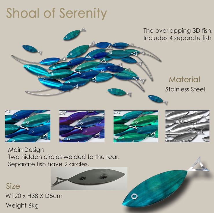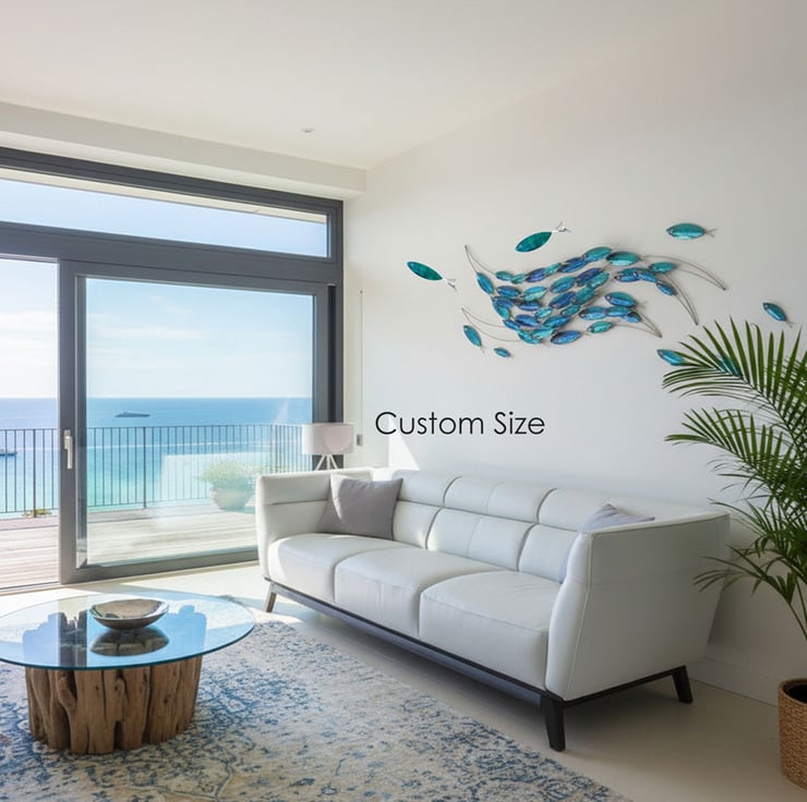 This handcrafted school of fish sculpture started as a simple sketch, inspired by a peaceful walk along the coastline, watching shimmering shoals glide through clear, sunlit waters. Back in my studio, I selected stainless steel for its strength and luminous quality, meticulously hand-cutting and shaping each fish to evoke the fluid motion of the ocean. I layered blue, teal, and silvery finishes to mimic the way sunlight dances on the waves, creating reflective surfaces that bring vibrant marine color into any setting. Each fish was carefully welded and arranged into a dynamic shoal, capturing the energy of sea life and the tranquility of beach living. Thoughtfully crafted for coastal homes, nautical interiors, or outdoor spaces, every sculpture is made with dedication and attention to detail—hoping to bring the spirit of the sea, a sense of relaxation, and a unique touch of contemporary art into your home or garden.