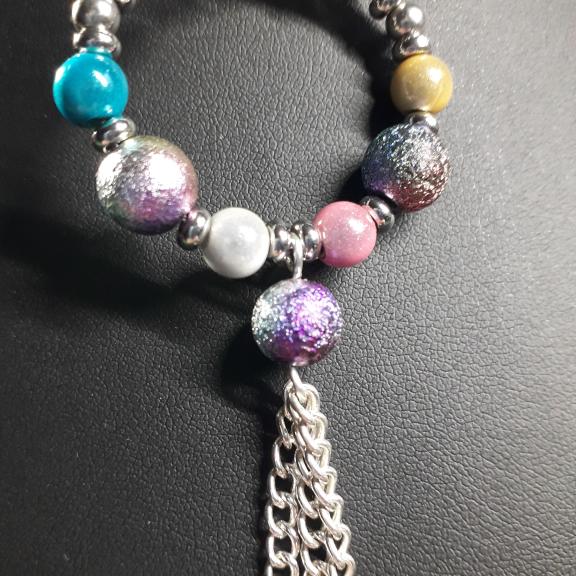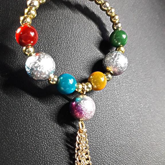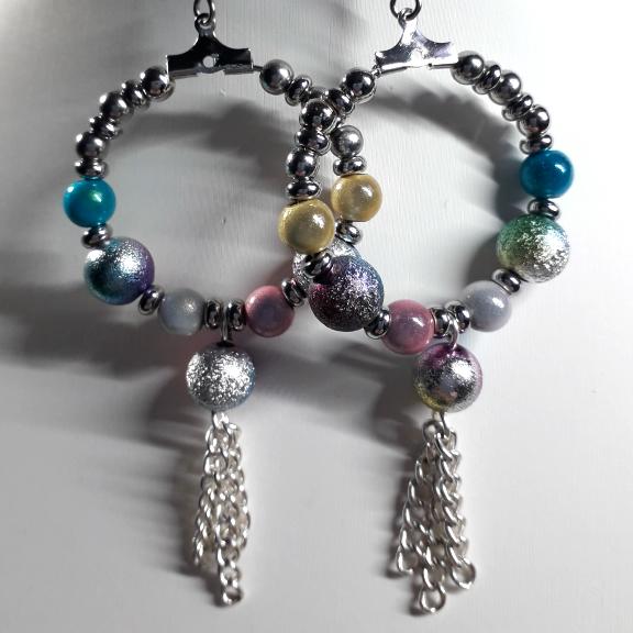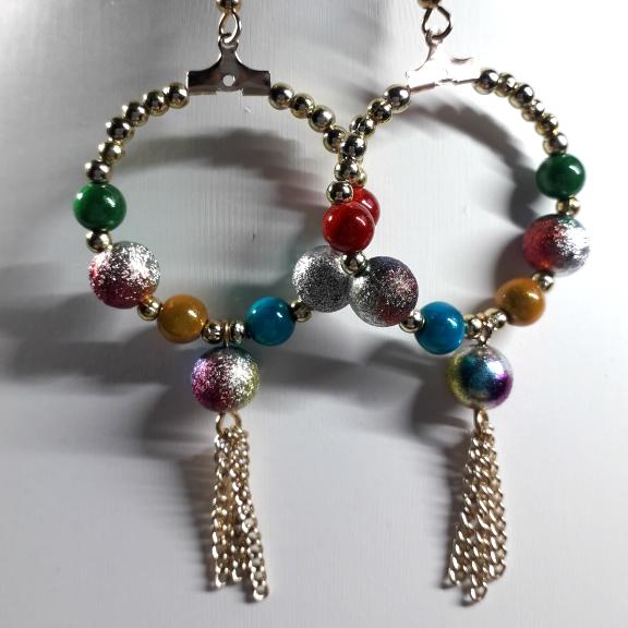 Dangly hoop earrings made with 3cm hoops in gold or silver, they are threaded with multicoloured stardust beads, miracle beads and small silver or gold spacer beads, the central bead has a tassel.