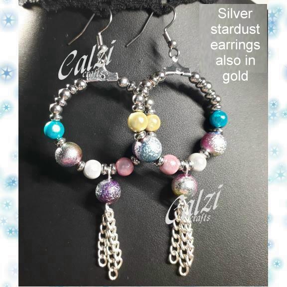 The total length of the earrings including the surgical steel hooks is 8.5cm, the stardust beads are 8mm.