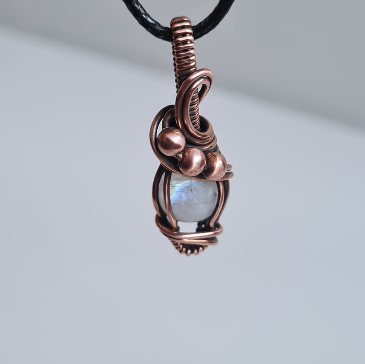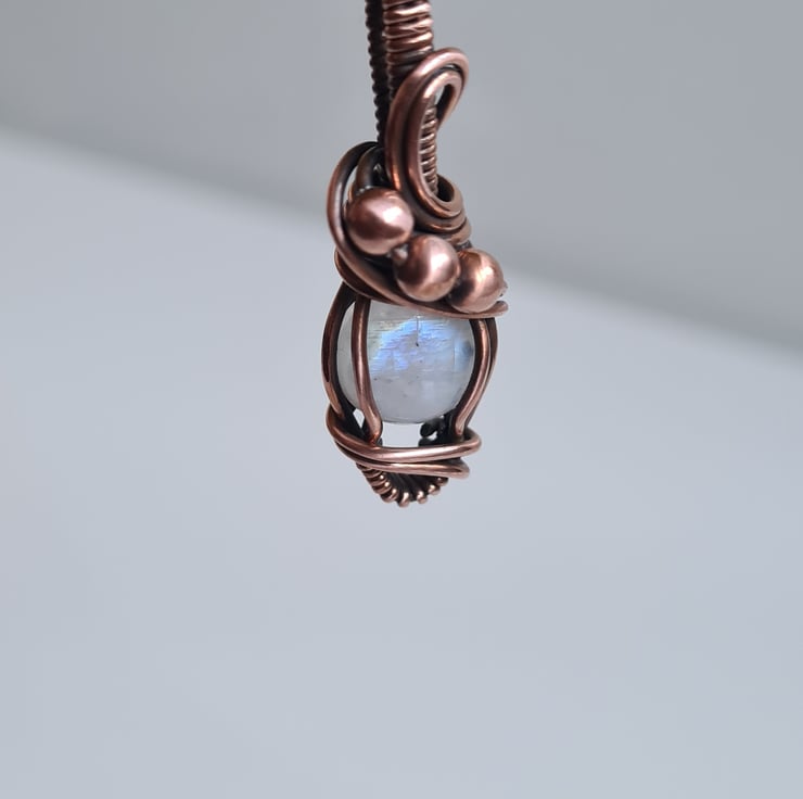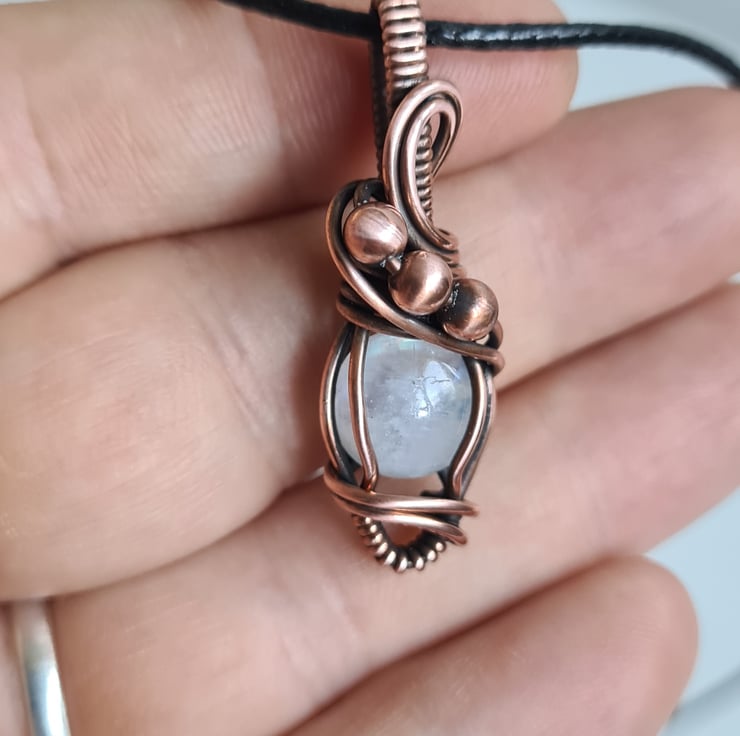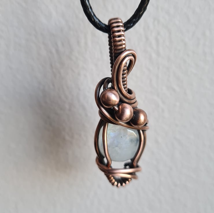 I have taken this lovely little Natural Rainbow Moonstone and handwrapped it in antiqued copper into this elegant design and finished with copper beads. This moonstone has a lovely subtle rainbow flash to the stone and looks amazing teamed with the copper.