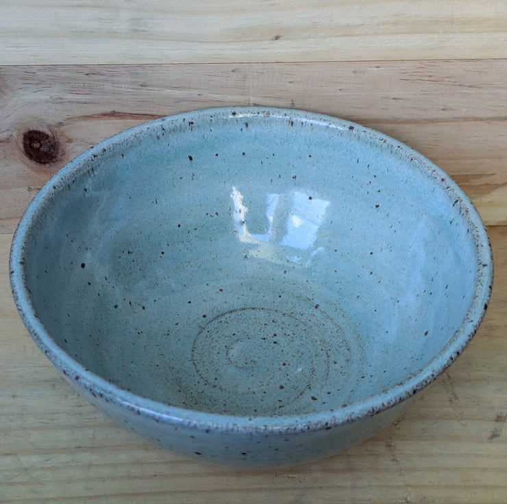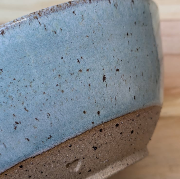 This is a soft, pale green glaze on a textured speckled clay which comes through the glaze when it's fired. I've left the bottom edge of the clay exposed on the outside so that you can feel it. The glaze also breaks over a swirl on the base inside. Fired in a kiln at a stoneware temperature (c1200 degrees) which makes them more durable.