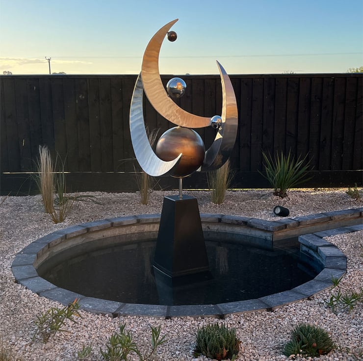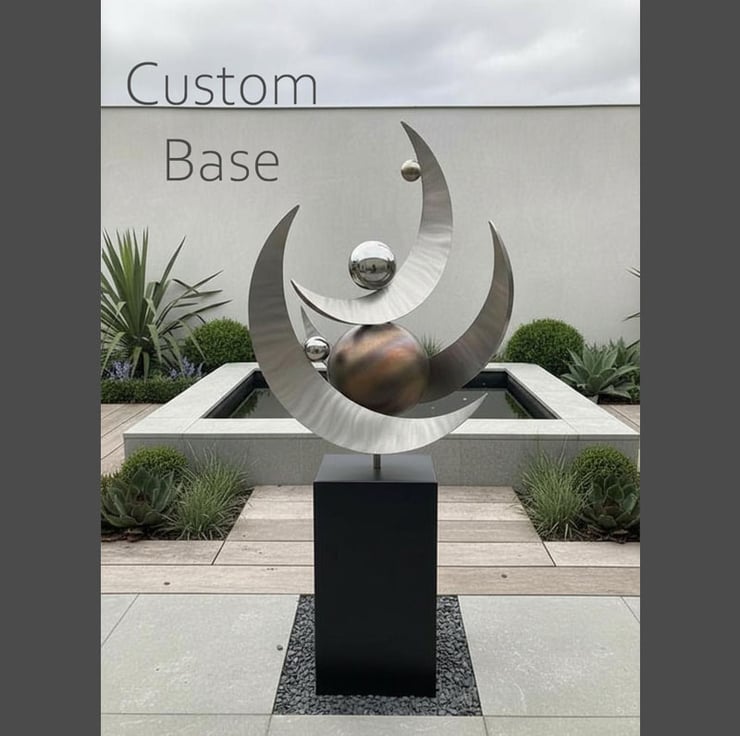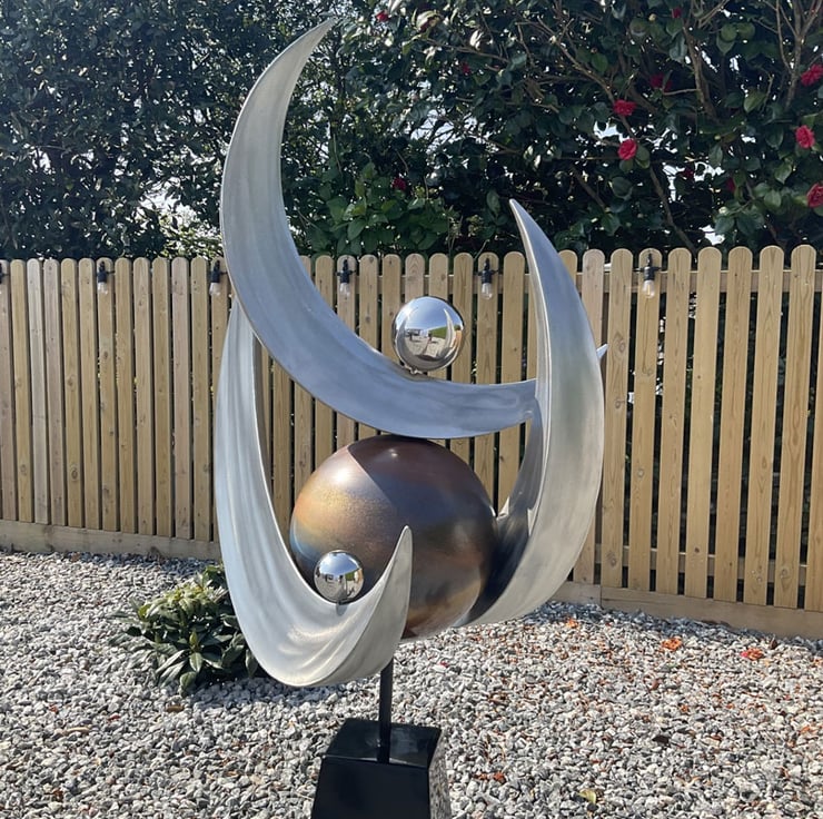 The inspiration for the Lunar Symphony sculpture came during a late evening walk, gazing up at the night sky as the moon and planets shimmered above the quiet landscape. I wanted to capture that sense of wonder and celestial harmony—how the shapes and movements of the cosmos evoke both mystery and calm. Back in my studio, I began sketching bold curves and spheres, combining them into a balanced composition that reflects the dance of moons and planets. Each piece of stainless steel was hand-shaped and textured to create dynamic reflections, echoing the ever-changing light of the sky. The result is a sculpture that brings that magical, peaceful feeling into any garden—a tribute to the beauty and tranquility of the universe.