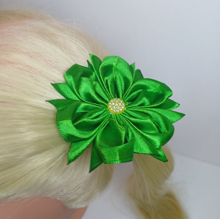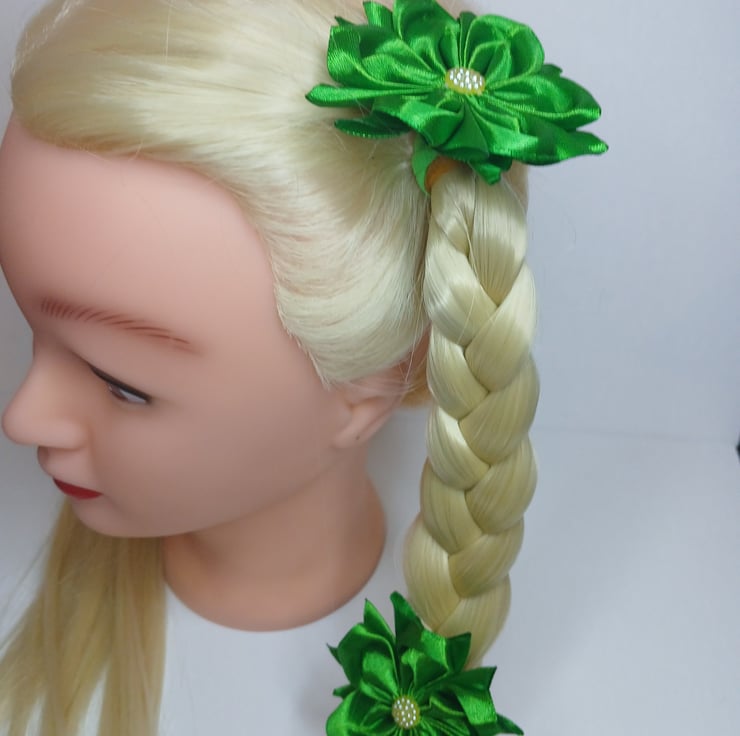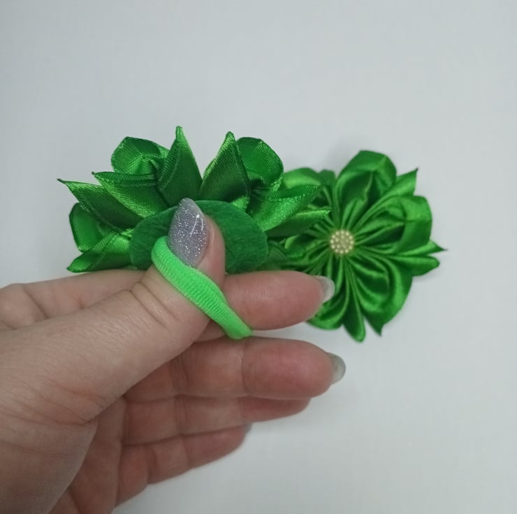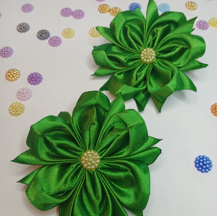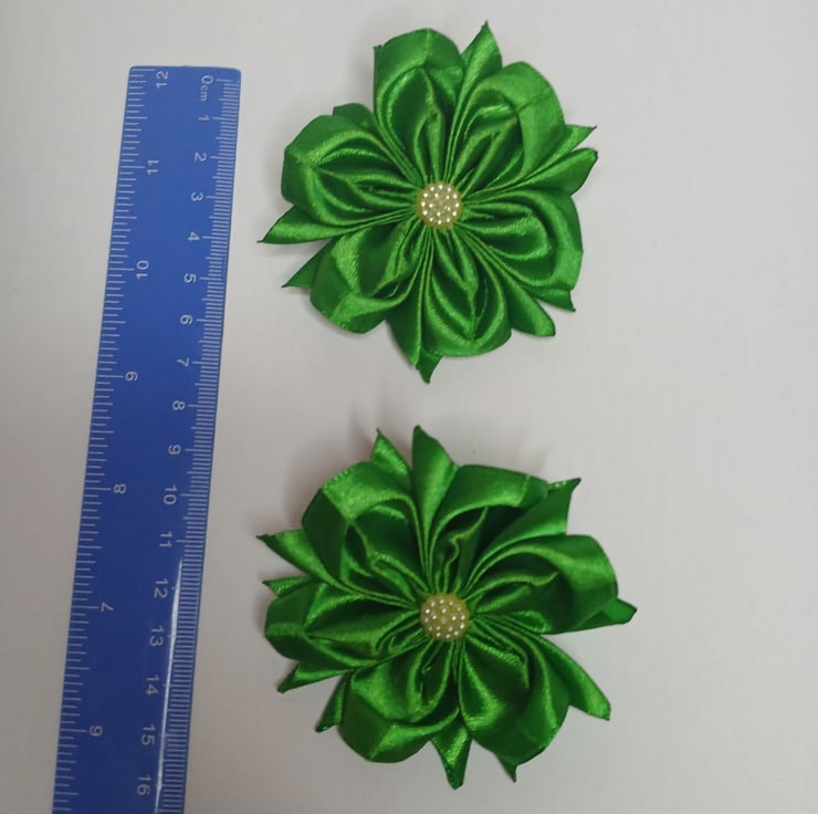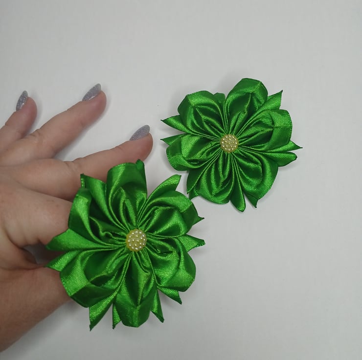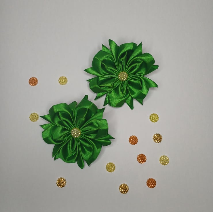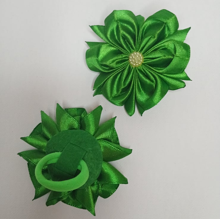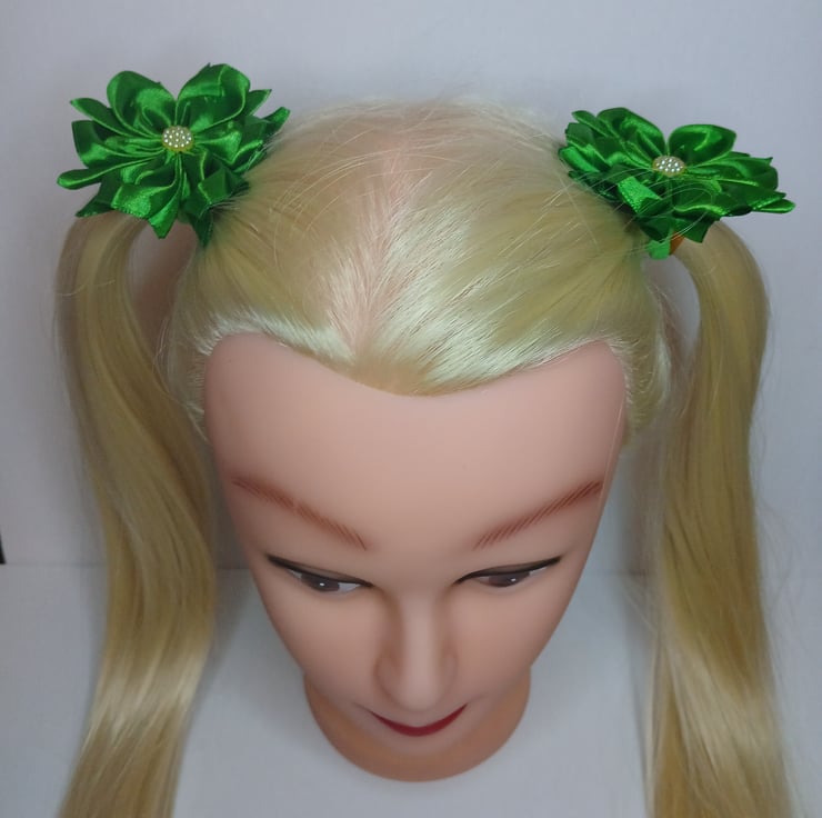 Pair of Green Satin Hair Flowers - Elastic Hair Bands for Pigtails