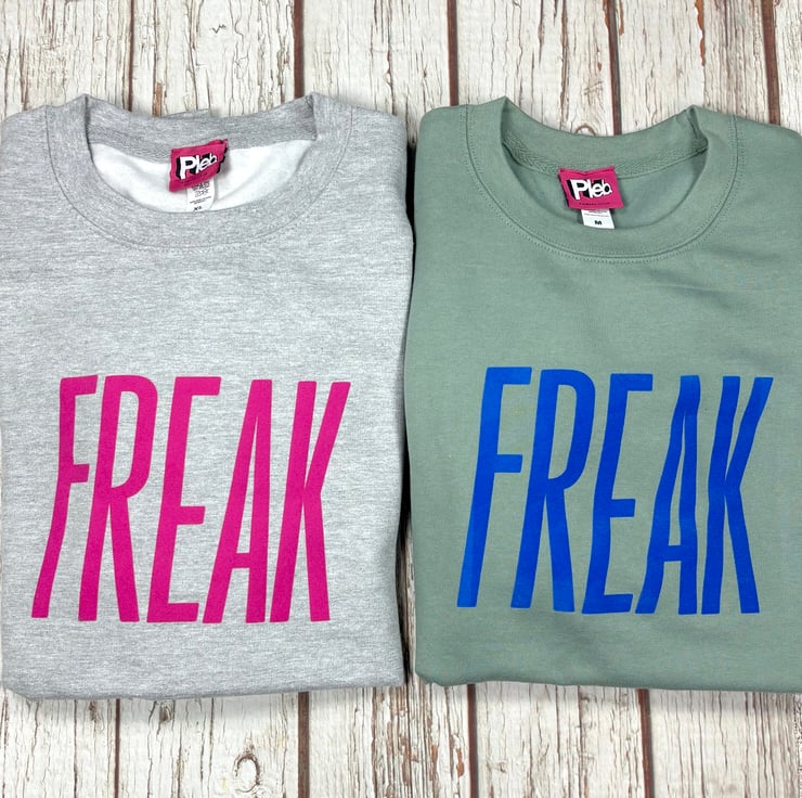 These are all high-quality sweatshirts with the Freak statement emblazoned across the chest in contrasting flock.