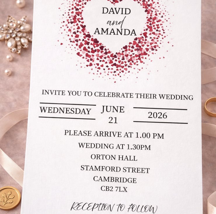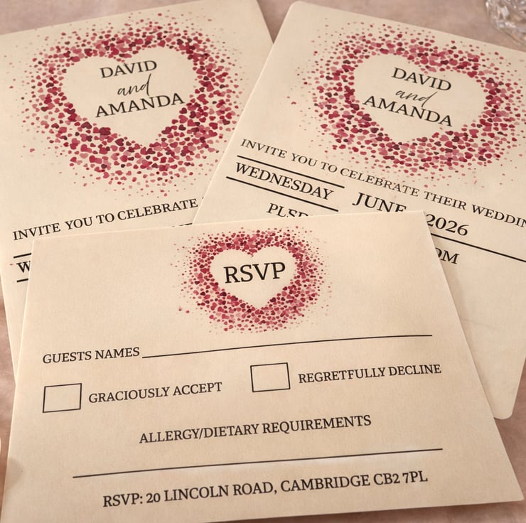 A stylish evening wedding invitation. featuring a romantic heart design made from delicate confetti-style details. Printed on quality white card with softly rounded corners, this 7x5 invitation is perfect for evening receptions and relaxed wedding celebrations.