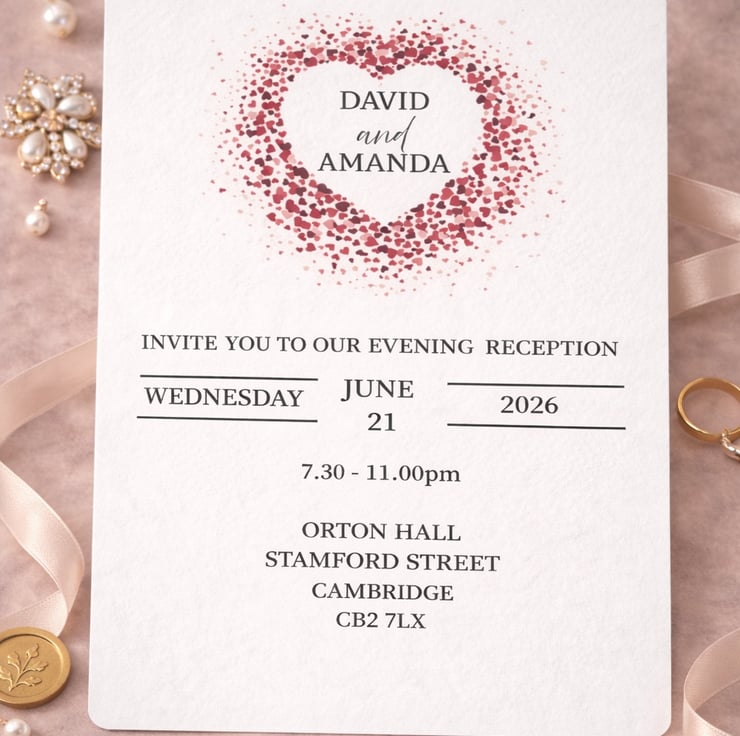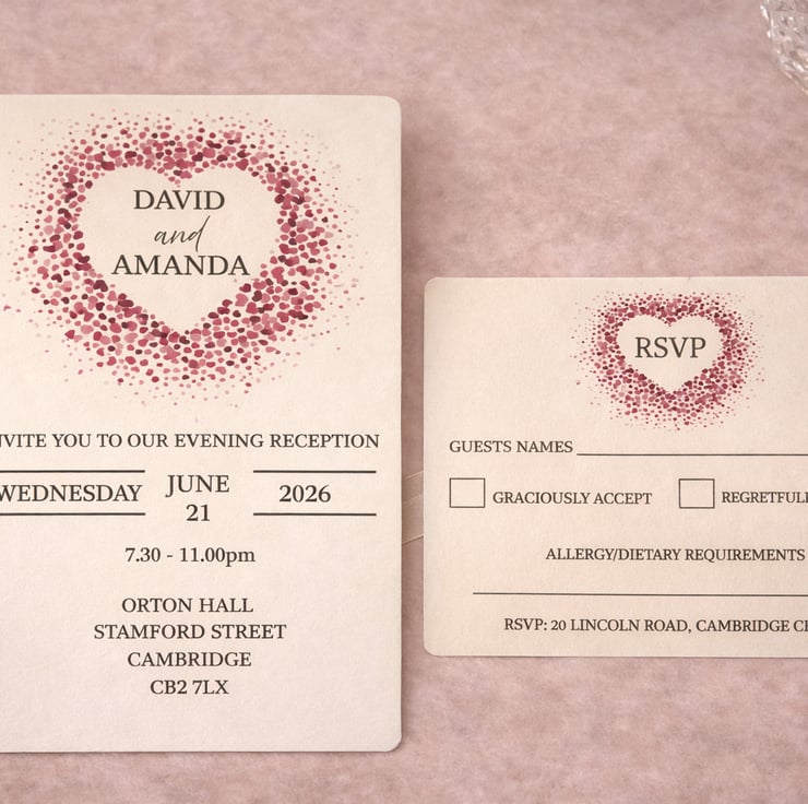 A stylish evening wedding invitation and matching RSVP card set, featuring a romantic heart design made from delicate confetti-style details. Printed on quality white card with softly rounded corners, this 7x5 invitation is perfect for evening receptions and relaxed wedding celebrations. The coordinating RSVP card allows guests to respond easily, keeping everything beautifully matched and elegant.
