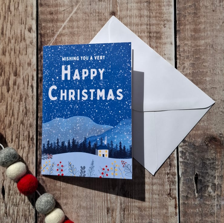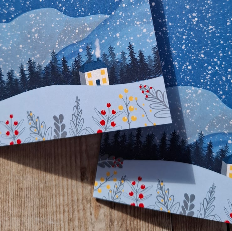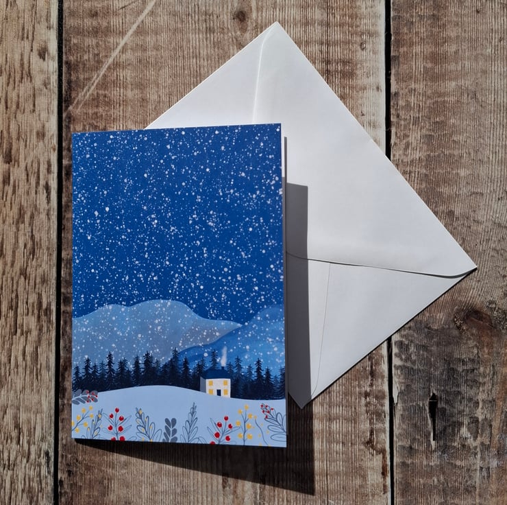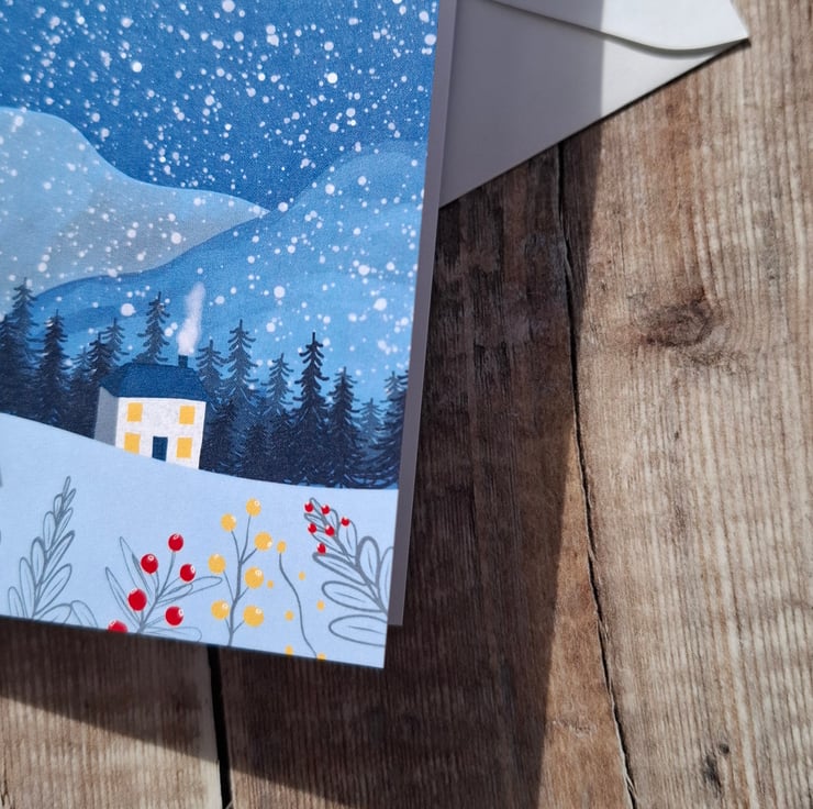 Professionally printed in the UK with my illustration of a cosy cottage in the snowy hills.