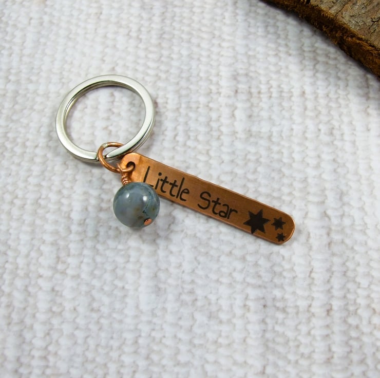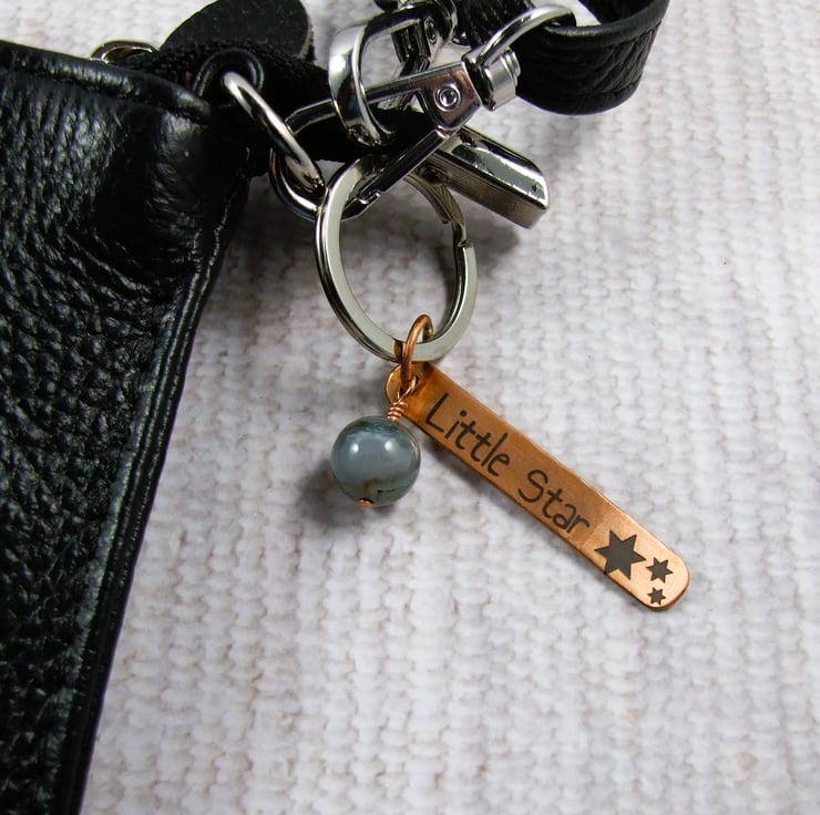 Bag Charm, copper laser etched with 'Little Star' and my own design stars pattern, paired with moss agate gemstone.