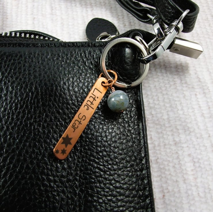 I have created the bag charm using 7mm wide flat copper wire to create the bars, cut shaped and hammered on one side. On the other side I have used artists software to design a star pattern and engraved this pattern onto the copper with the words Little Star. I have paired with a 10mm Moss Agate gemstone bead, securely wire wrapped in place. Fitted to a 25mm steel spiral ring.
