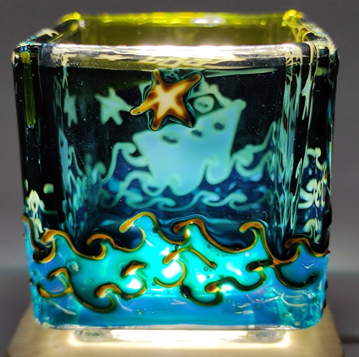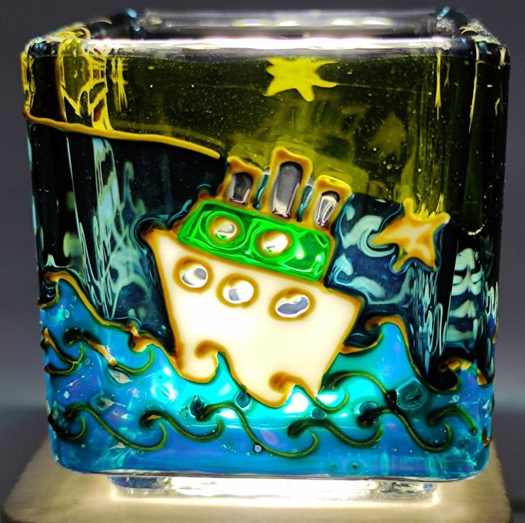 Hand painted glass candle holder, lighthouse and ship in a storm