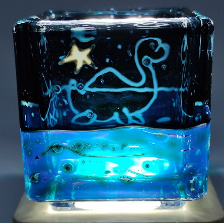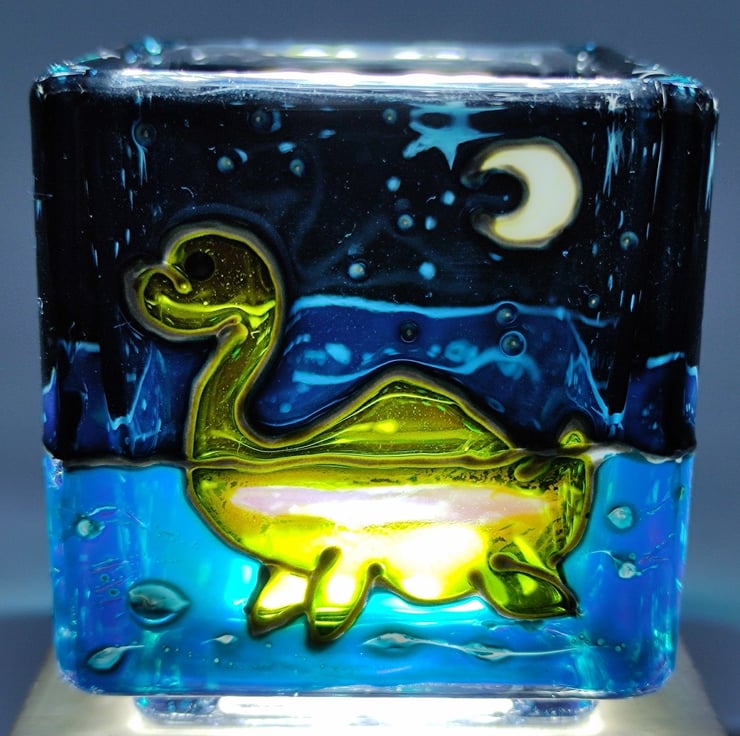 Hand painted glass candle holder, Nessie the Loch Ness Monster