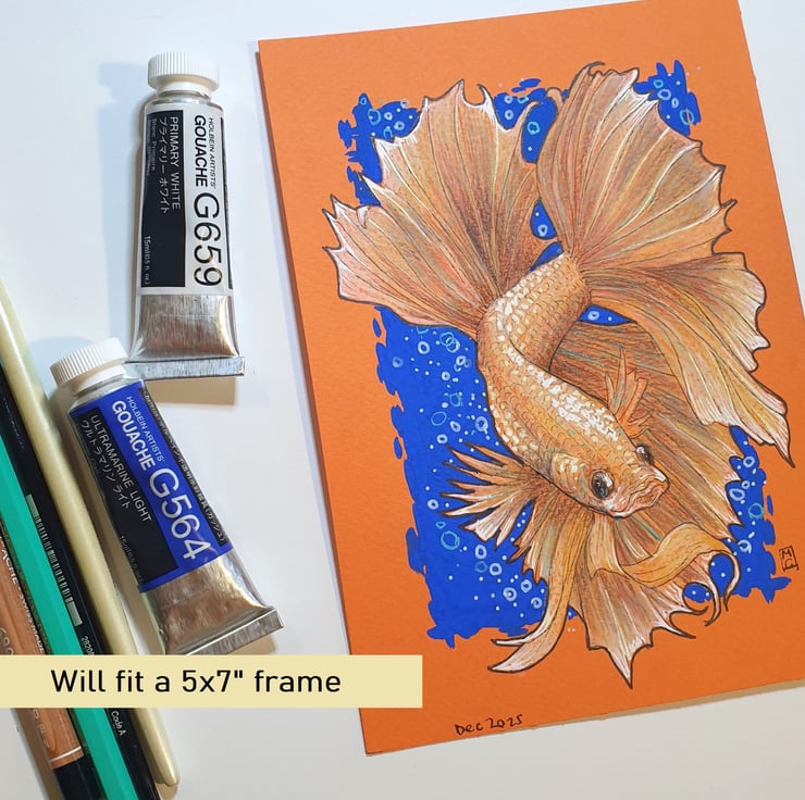 A small colour drawing of an orange betta fish with a dark blue background with a suggestion of bubbles. The artwork is on orange paper and has high contrast colour tones.