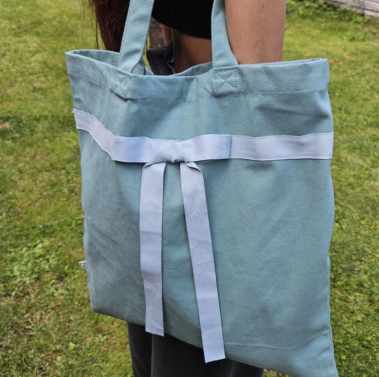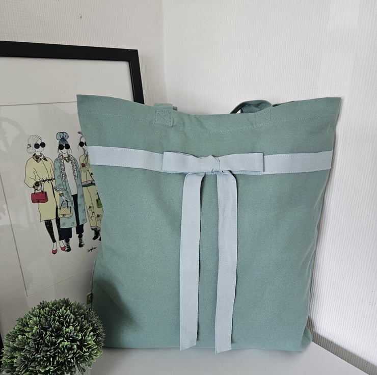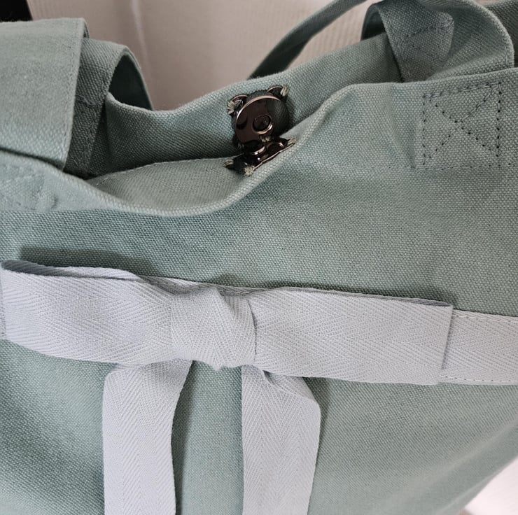Organic Cotton Tote Bag: Sea Green Herringbone Bow, Magnetic Closure