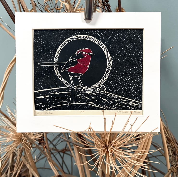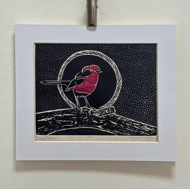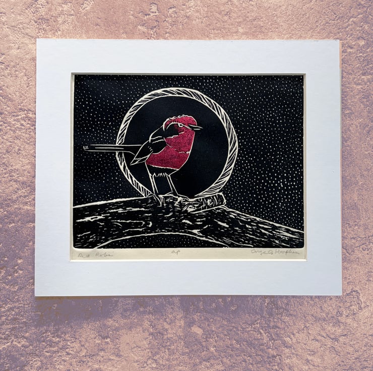 Red Robin linocut, with pearlised hand watercolour, mounted and with backing board. The pearlised watercolour does not photograph well. It has a lovely sheen.