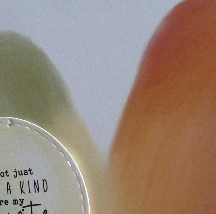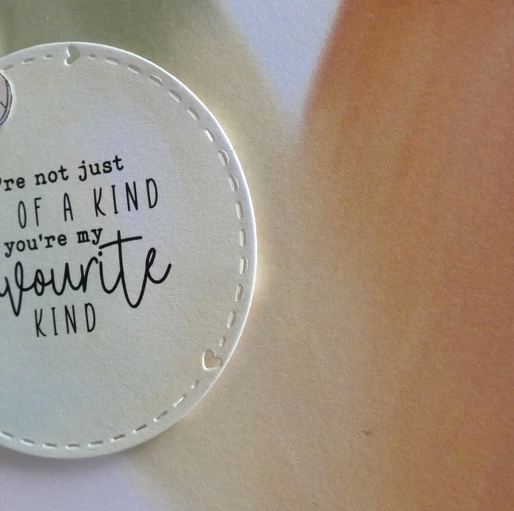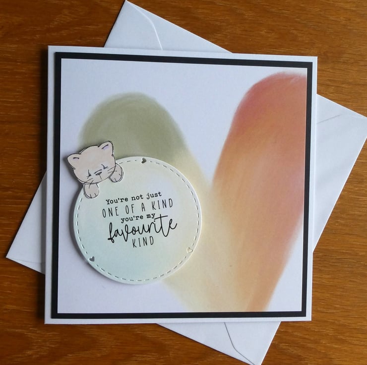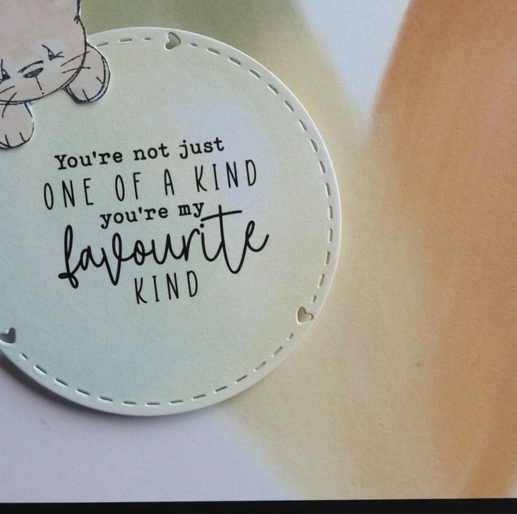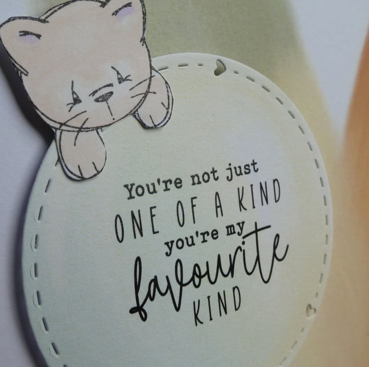 It features a cute cat which has been hand stamped, inked in shades of orange and cream and carefully cut. It has been positioned to be looking over a circular die cut message printed with the words 'You're not just one of a kind you're my favourite kind' on a pale lemon and green background.