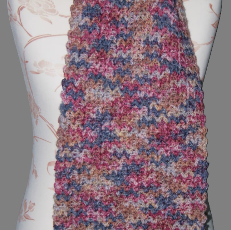 The scarf is a very lovely 'Berry Mix.' It is very soft to the touch and would be very warming and cosy throughout the autumn and winter seasons. It is 100 % premium acrylic. I have taken pictures that are as close as possible to the true colours but it may appear slightly different on your computer. Made with kind permission of original pattern designer.