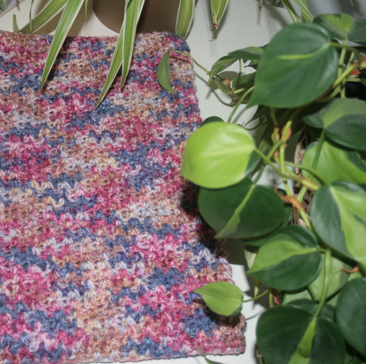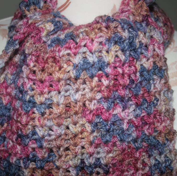 The scarf is a very lovely 'Berry Mix.' It is very soft to the touch and would be very warming and cosy throughout the autumn and winter seasons. It is 100 % premium acrylic. I have taken pictures that are as close as possible to the true colours but it may appear slightly different on your computer. Made with kind permission of original pattern designer.