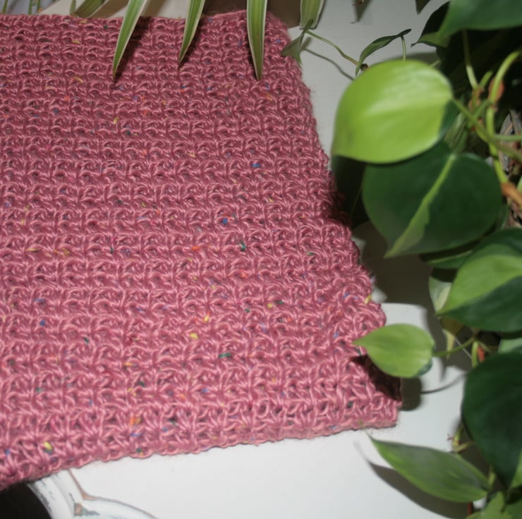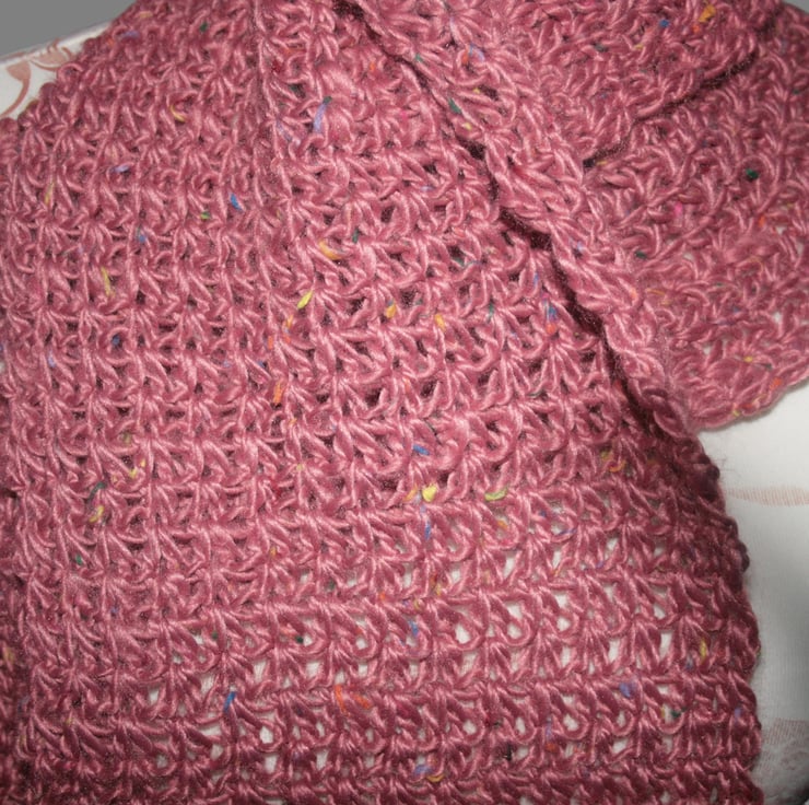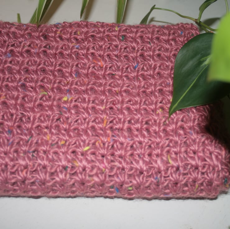 I was drawn to the pretty rich pink shade of wool and thought it looked different with the flakes of colour throughout and the fact it is made of recycled polyester (94%) is interesting. It states that 'this yarn is made from recycled bottles.' It is also very soft.