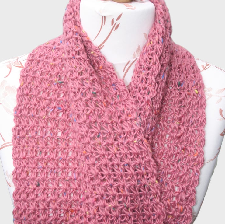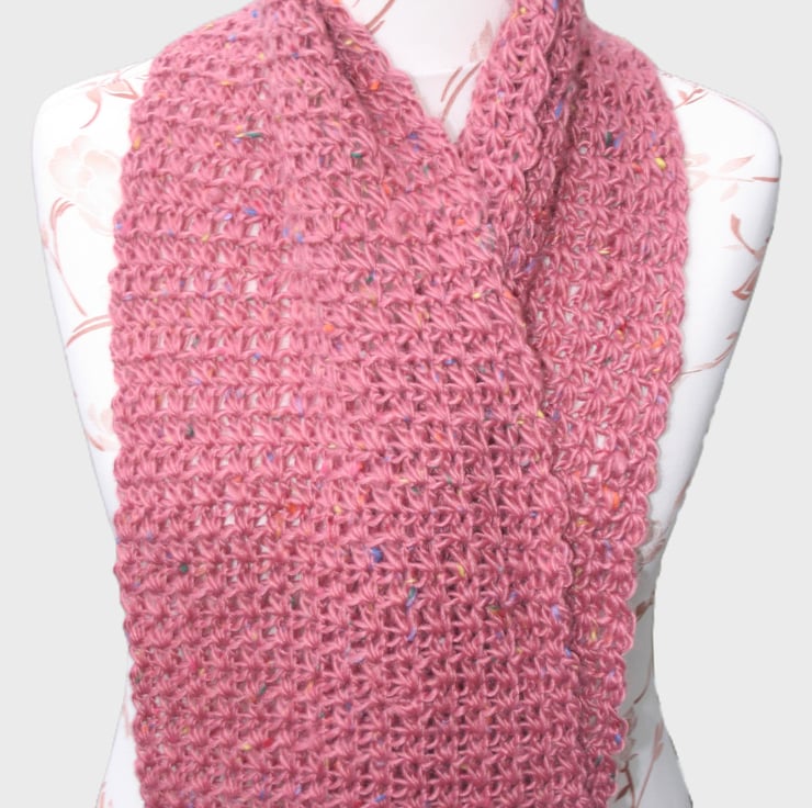 A very pretty rich, deep toned pink scarf with flecks of orange, blue and yellow throughout. It is very soft to the touch, silky soft, and is made of 94% Recycled Polyester, 4 % Acrylic, and 2% Viscose. The scarf measures approximately 66 inches (L) and 9 and a half inches (W). I have made every effort to capture the true colour of the scarf but it may appear slightly different on your computer screen. As it is so soft please be careful so as not to snag it with a finger nail. It is very soft indeed.