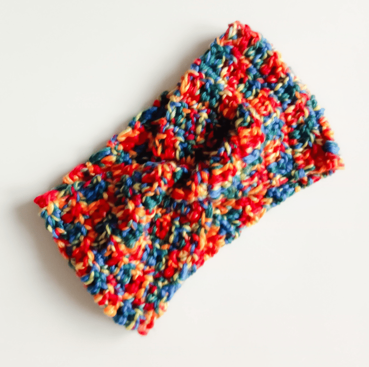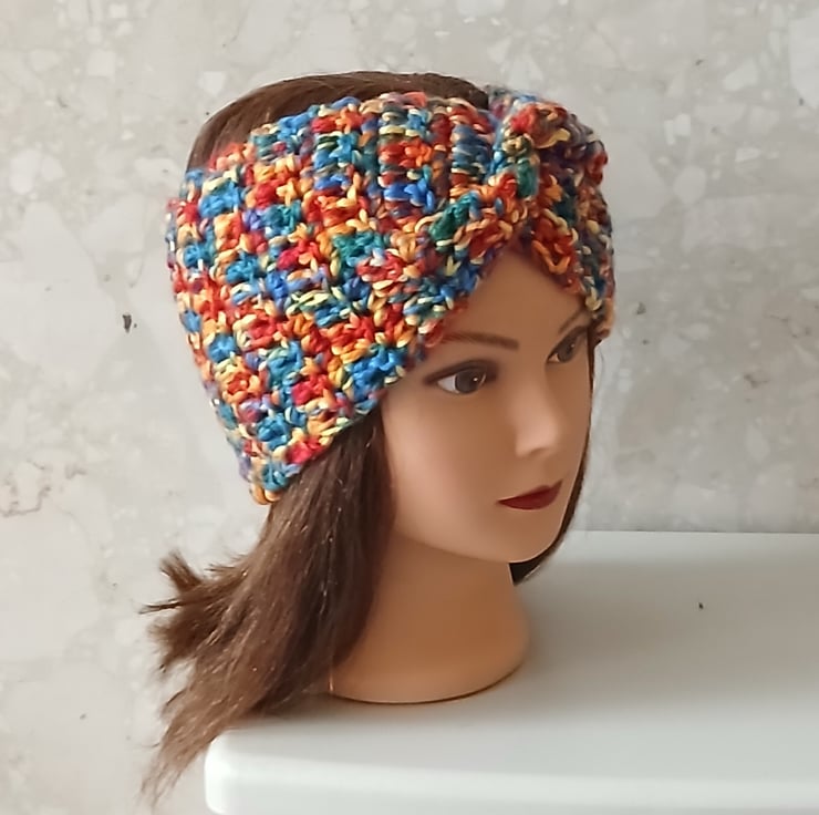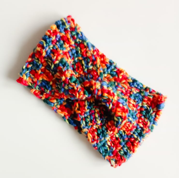 The headband is made with Divante knitting yarn in shade Rainbow Ombre using a 7 mm (K) crochet hook. To fit: To fit: adult. Length: 50 cm or 20 inches. Width: 14 cm or 5.5 inches.