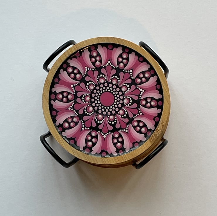 Coaster Size: 10cm Wide, 1.2cm Depth, Metal Coaster Holder Size: 11cm Wide, 7.3cm High - Set of 6 Pink Mandala Hand Painted Coasters With Metal Coaster Holder.