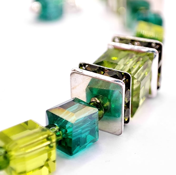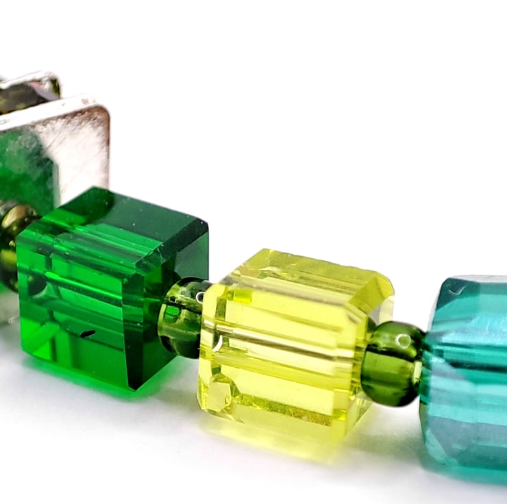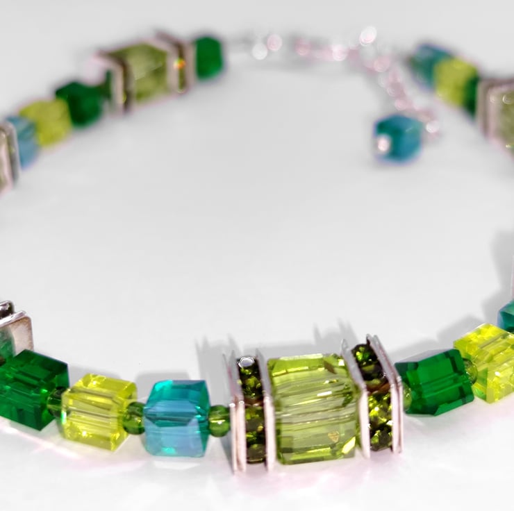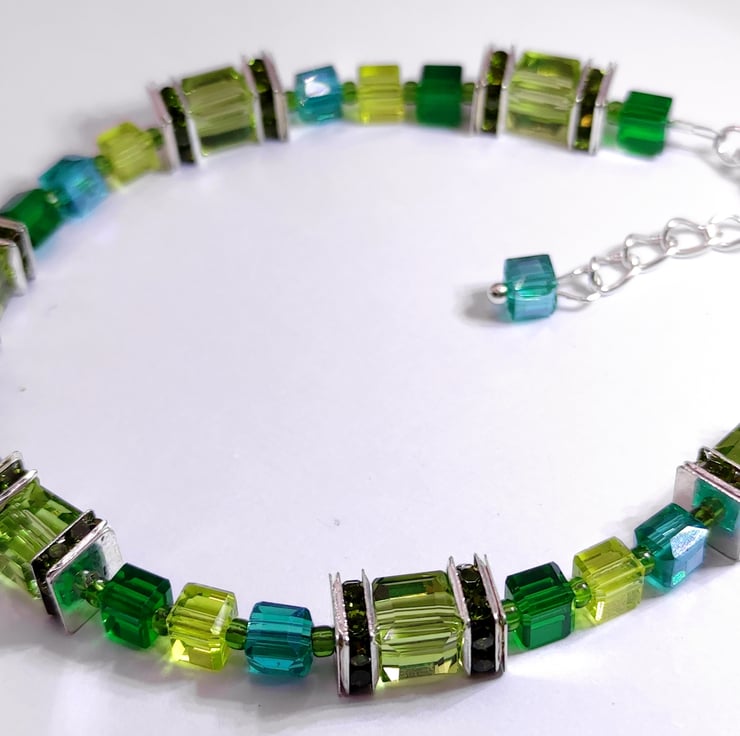 Handmade crystal and silver plated bracelet. I chose the colours of the season, the greens of winter, holly, spruce and fir for this one. 18cm from the clasp to the start of the extender chain.