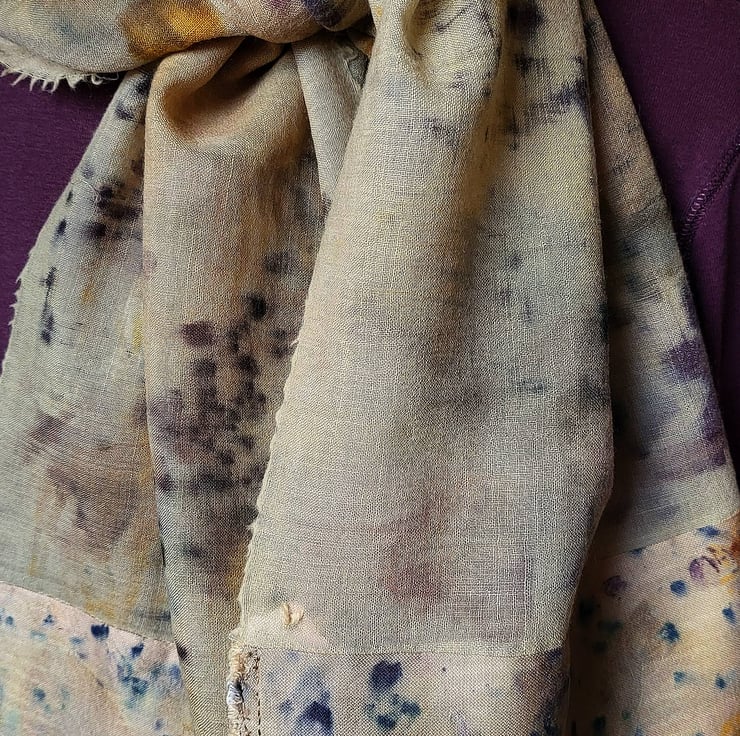 Fine wool scarf with silk end borders. Overall warm gold merged tones. Eco printed with natural plant dyes including leaves, Orange Coreopsis, Black Hopi Seeds, Purple Scabious, Purple Hesperanth. Gold green background abstract blurred leaf prints. Scattered deep purple colours from seeds. Has 5 inch doubled eco printed satin smooth peace silk border ends in similar eco prints of orange Coreopsis and Black Hopi seed. Length 66 inches (1608mm) Width 13 inches (400mm).