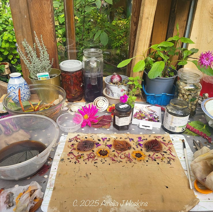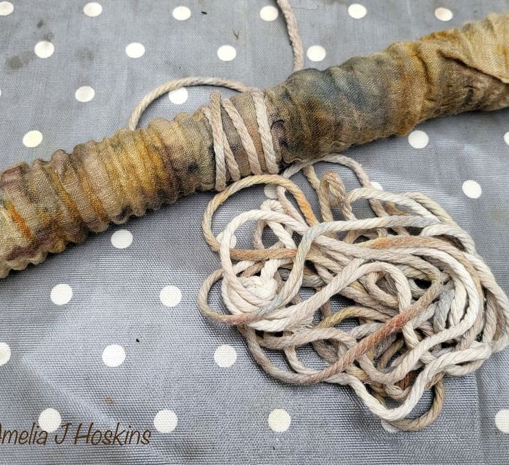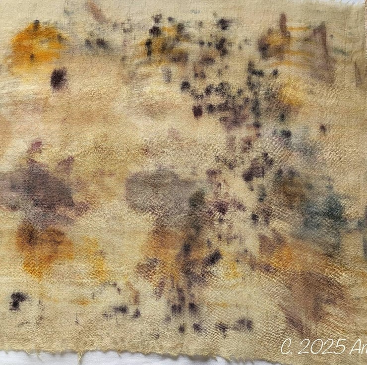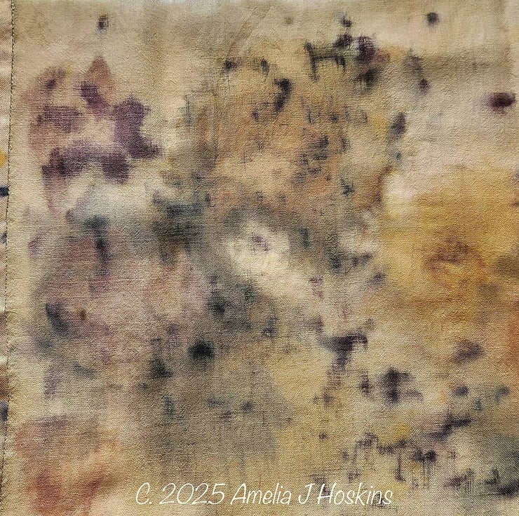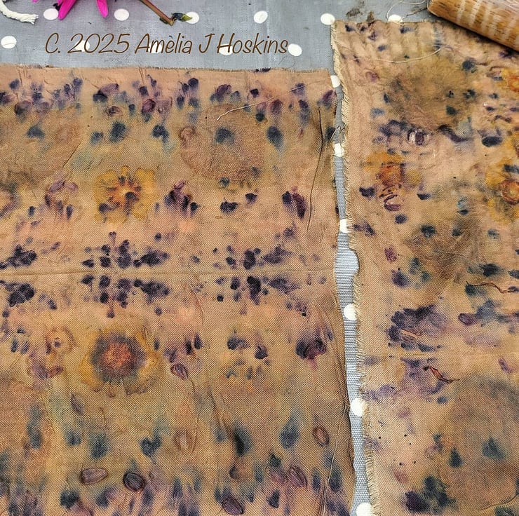 Experiments on fine wool show eco prints work well with an result. Images show some of the processes. The scarf was eco printed and steamed twice as first leaf print was feint. Yellow orange coreopsis flowers were added as well as Black Hopi Seeds which give violet to black. These flowers were used in the coordinating silk border which gives a flourishing shine at the ends. Accurate colour is the flat laid images.