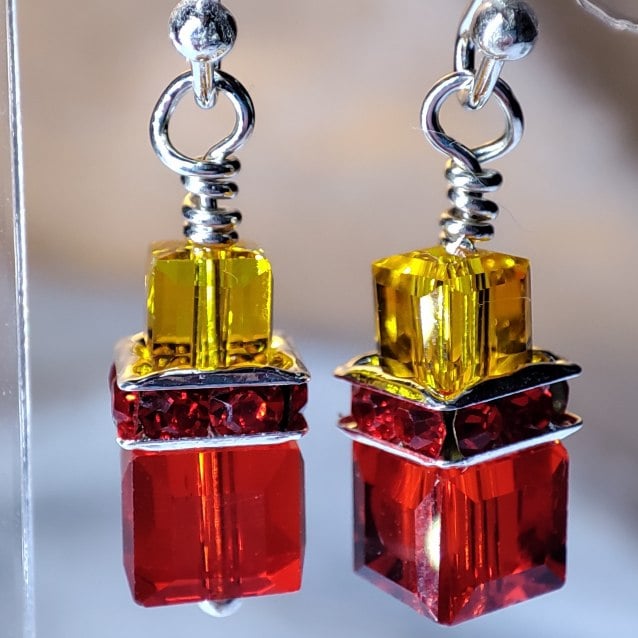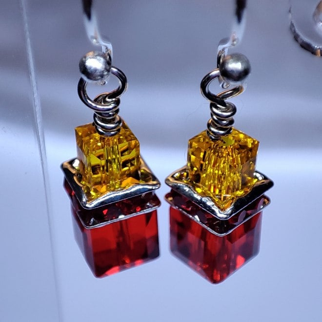 Crystal earrings with silver plated wires. Made with glass crystal beads and rhinestone spacer beads on silver plated wire, hanging from silver plated earwires. Approximately 2.5cm from bottom of the earwire to the bottom of the beads.