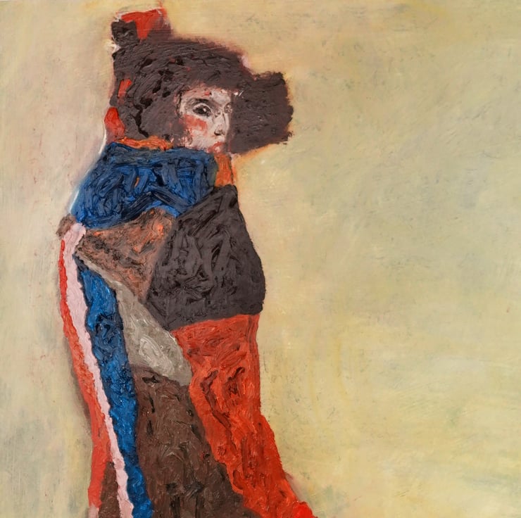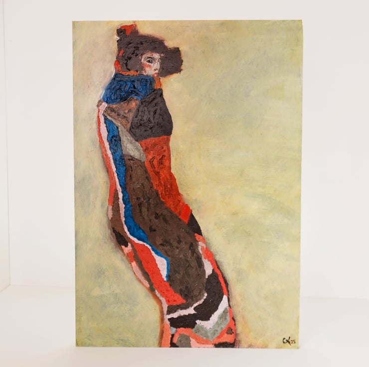 Inspired by Egon Schiele's beautiful drawing of 'Moa'. I have painted this freehand using only a small reference picture. Different to Schiele's masterpiece, I began first with a charcoal sketch and then over painted in oil, using thick impasto oil for the dress with those rich colours. There is a lot of texture in the dresscoat which I have also extended further than the original. I've used a strong royal blue, which sits very well with the burnt orange, chocolate, lilac, orange and gold colours of the dress. Moa's dresscoat in real life must have been incredible.
