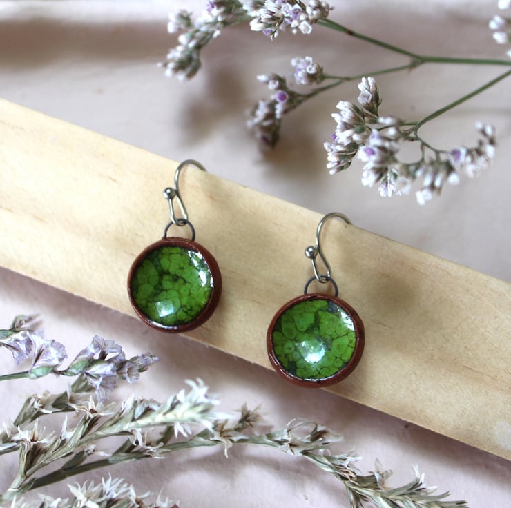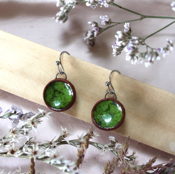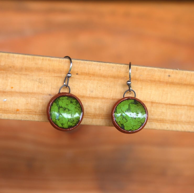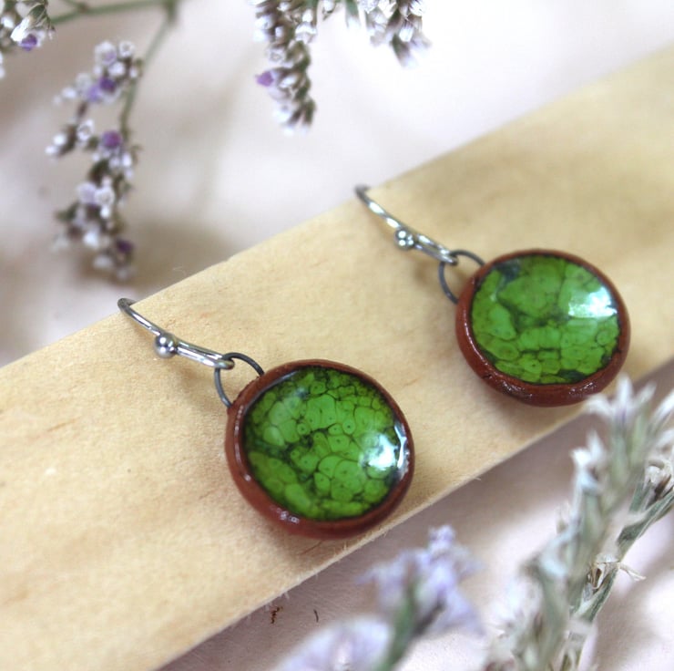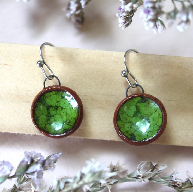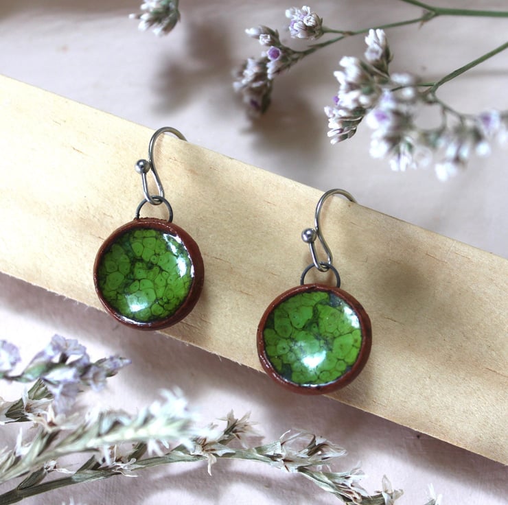 These beautiful handmade green glazed ceramic earrings are completely unique.