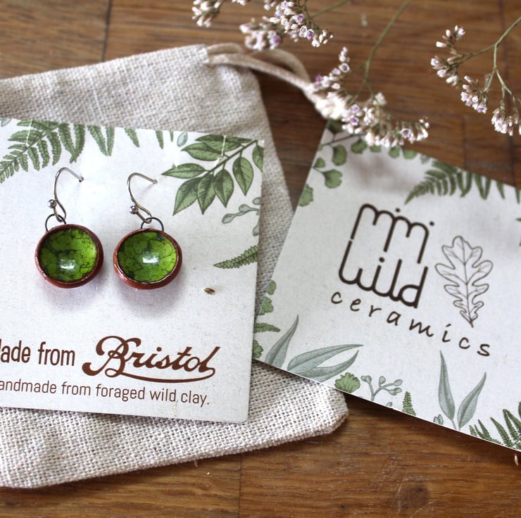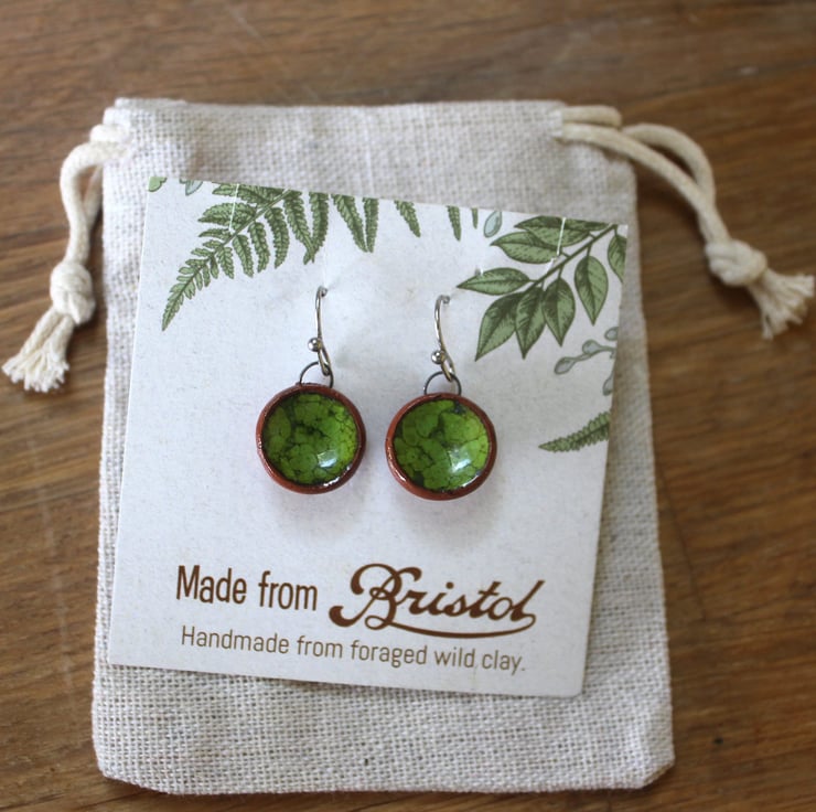 I make all my earrings from clay I forage myself from my home in Bristol, UK. Making them some of the most sustainable earrings in the world! I have been working with foraged clay for a couple of years now and am obsessed with the beautiful texture created when paired with these rich deep glazes! Once I have processed the clay and made my earring designs, they are then fired to earthenware (1060 celcius) temperatures and become ceramic.
