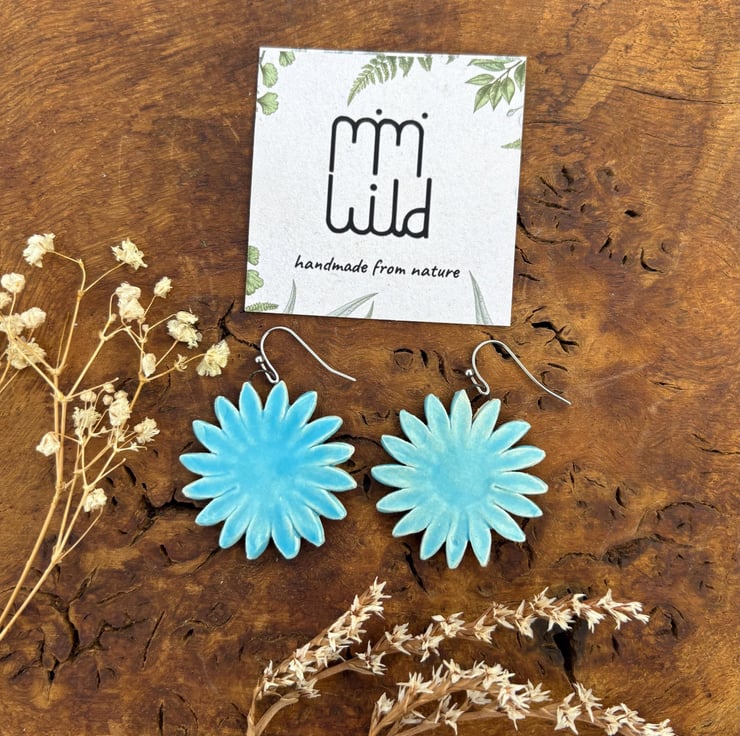 Handmade Ceramic Daisy Earrings, Foraged Dartmoor Clay, Stainless Steel, Blue Ye