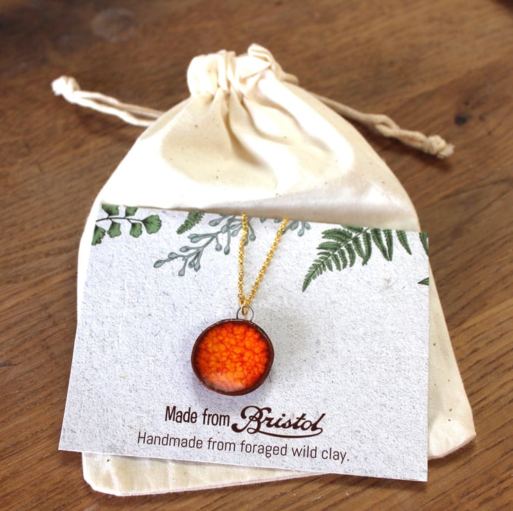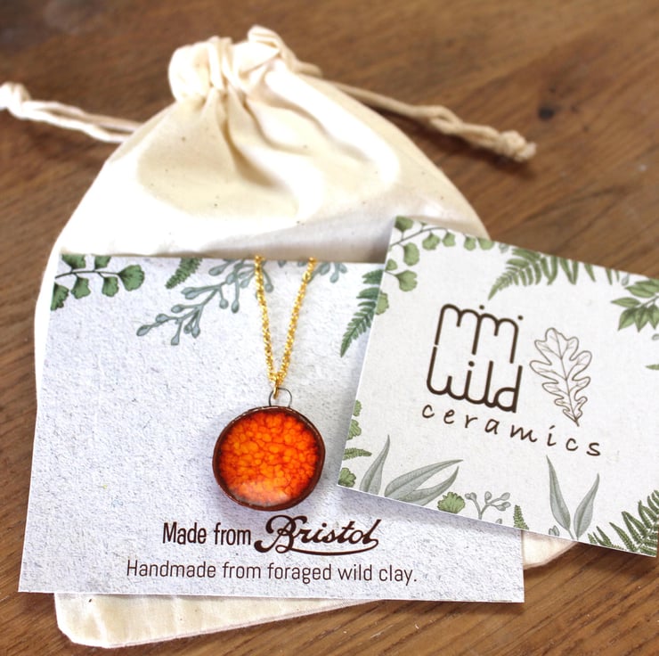 I make all my necklaces from clay I forage myself from my home in Bristol, UK. Making them some of the most sustainable jewellery in the world! I have been working with foraged clay for a couple of years now and am obsessed with the beautiful texture created when paired with these rich deep glazes! Once I have processed the clay and made my earring designs, they are then fired to earthenware (1060 celcius) temperatures and become ceramic.
