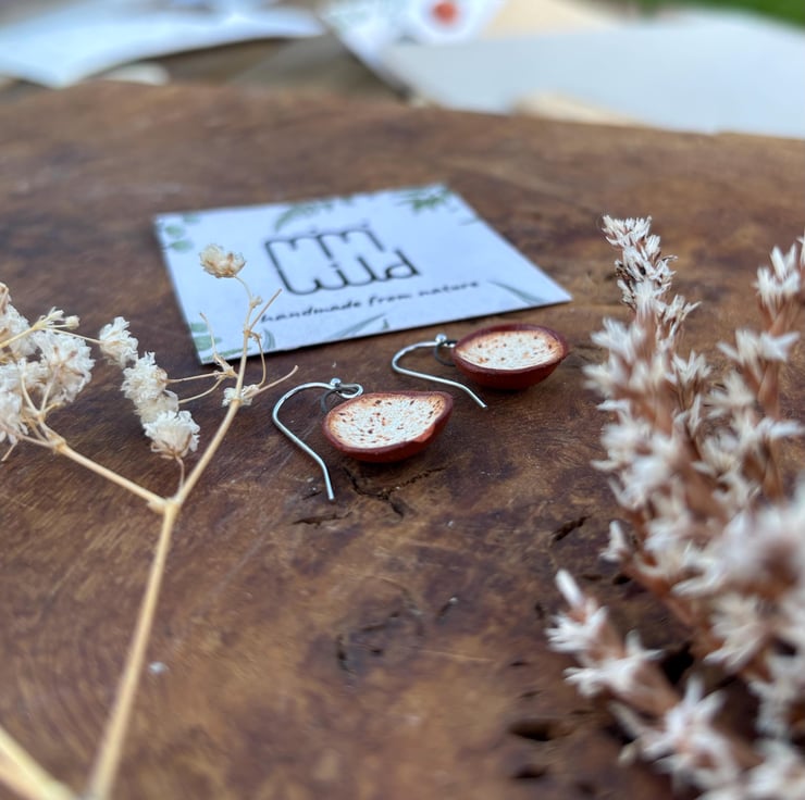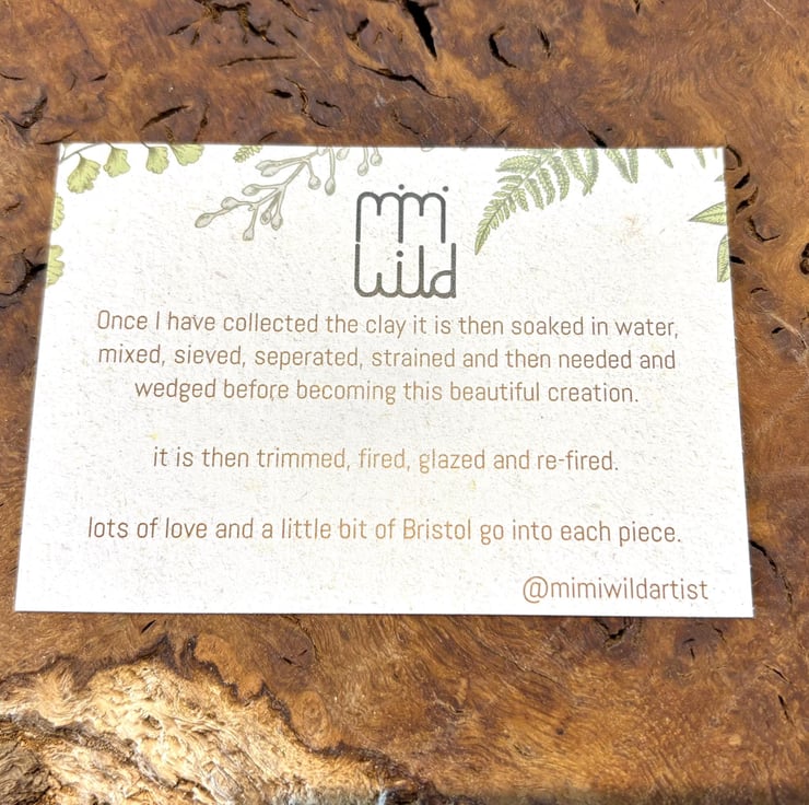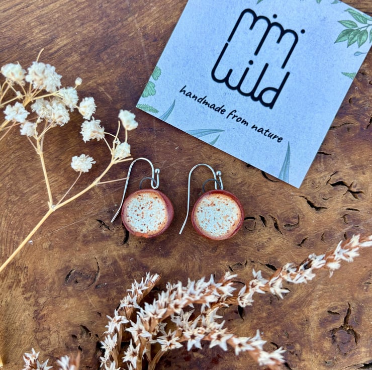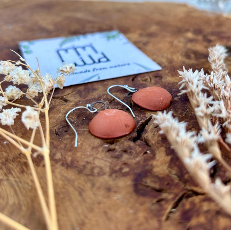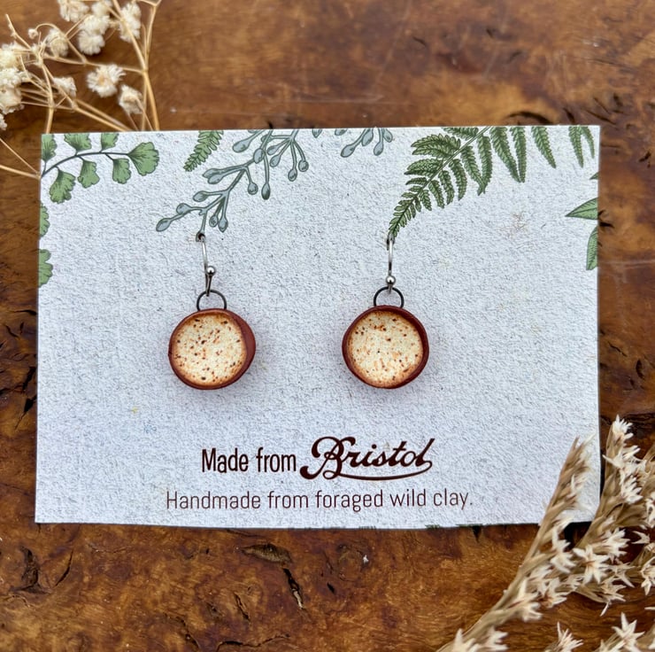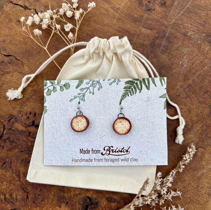 I make all my earrings from clay I forage myself from my home in Bristol, UK. Making them some of the most sustainable earrings in the world! I have been working with foraged clay for a couple of years now and am obsessed with the beautiful texture created when paired with these rich deep glazes! Once I have processed the clay and made my earring designs, they are then fired to stoneware (1220 celcius) temperatures and become ceramic.