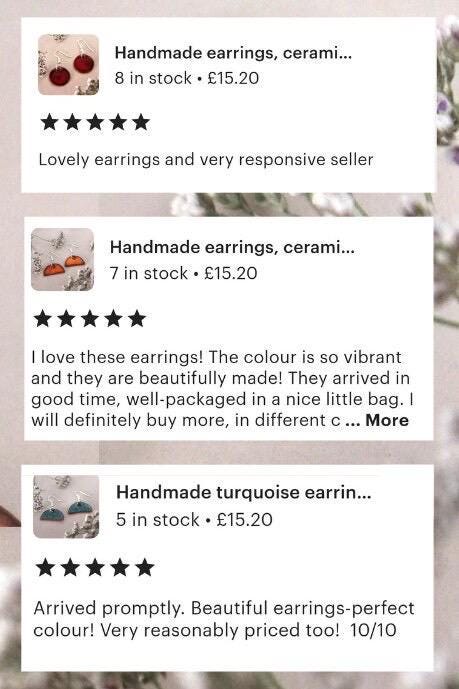 The picture shows the design and glaze used but due to the exciting nature of ceramics each pair will have slight variations. The backs are unglazed exposing the wild terracotta coloured clay. The hooks are made with hypoallergenic stainless steel.