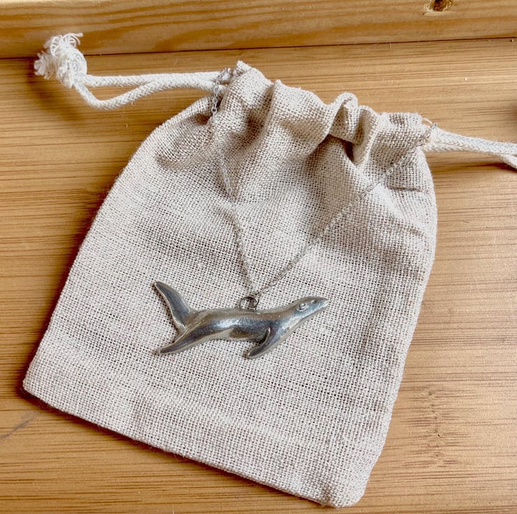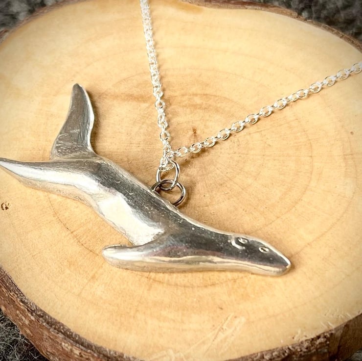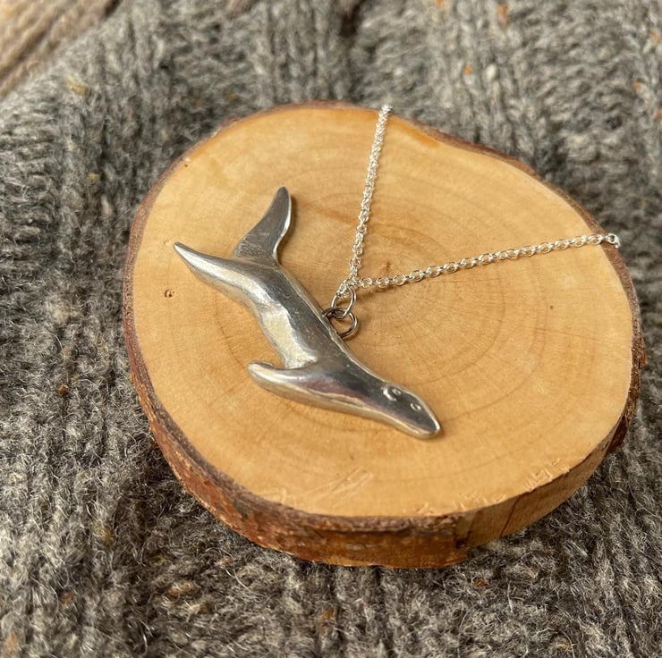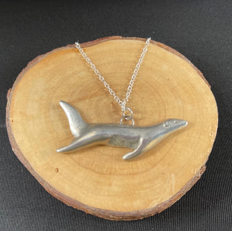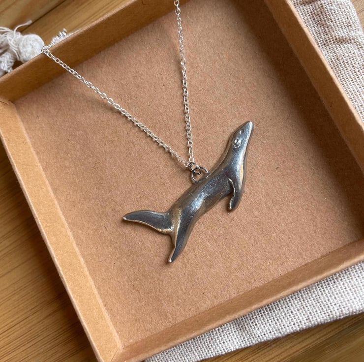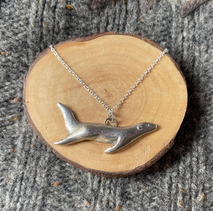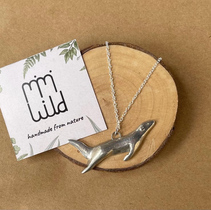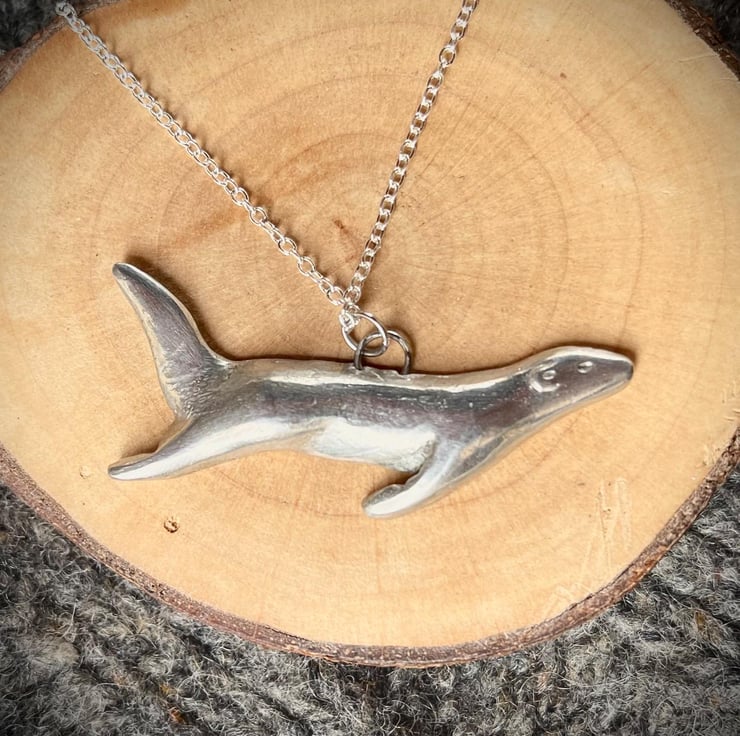 Each beautiful slender otter comes on an 18 inch silver chain and comes in an eco hand stamped gift box. The otters are made of 100% recycled pewter mugs which I cut up and then heat to around 250 degrees before pouring into my mould. These are then trimmed, buffed and polished to produce a beautiful shiny surface.