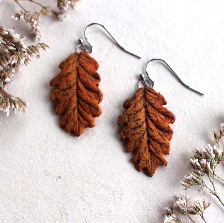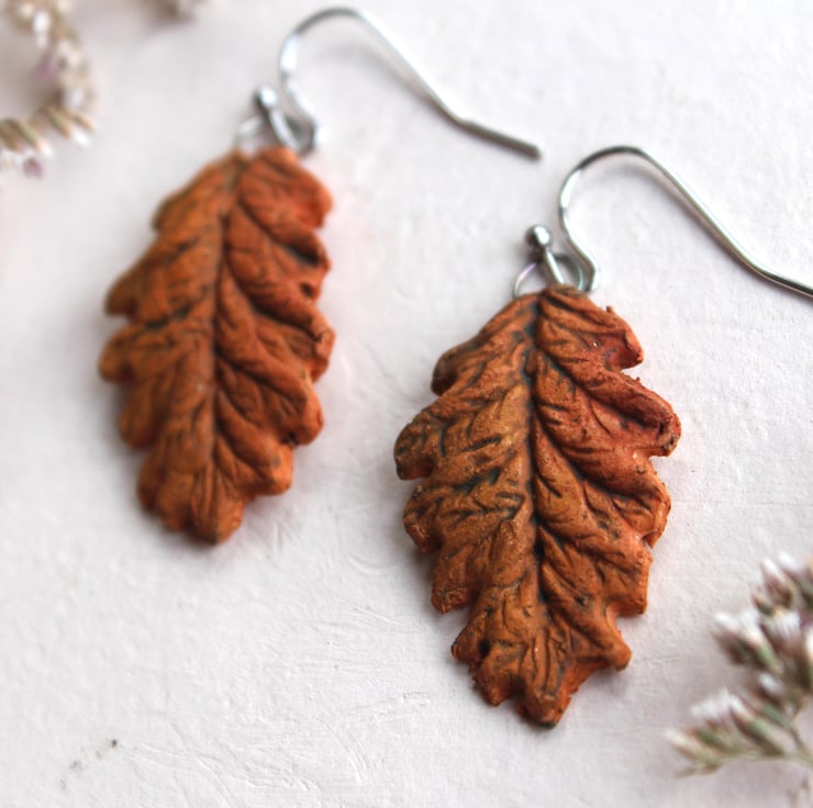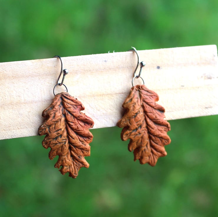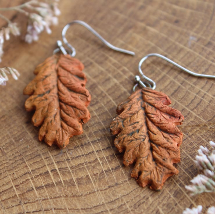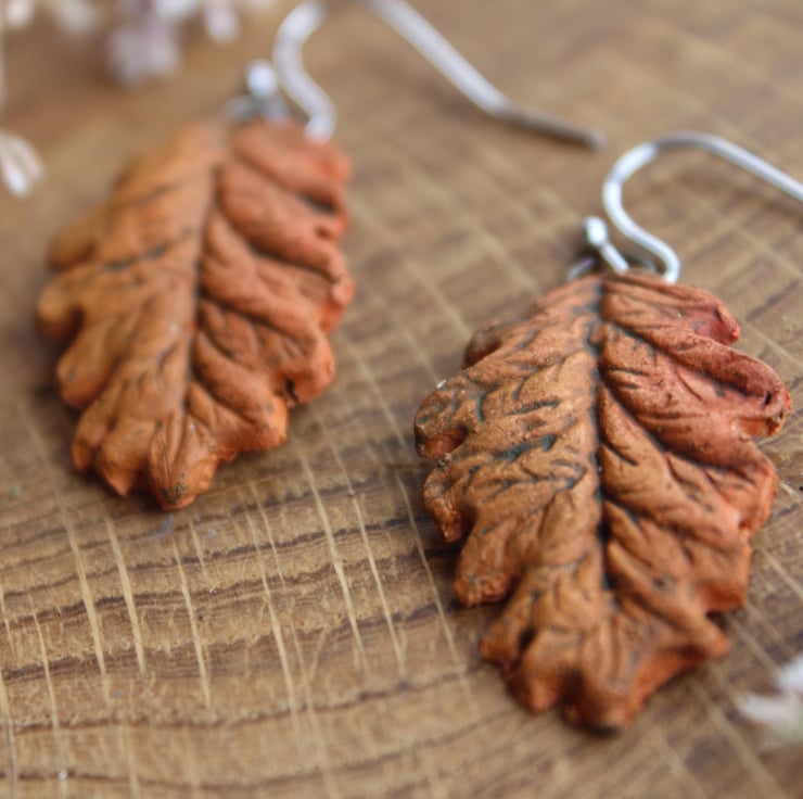 Natural handmade autumn orange oak leaf ceramic earrings are so much fun to make.