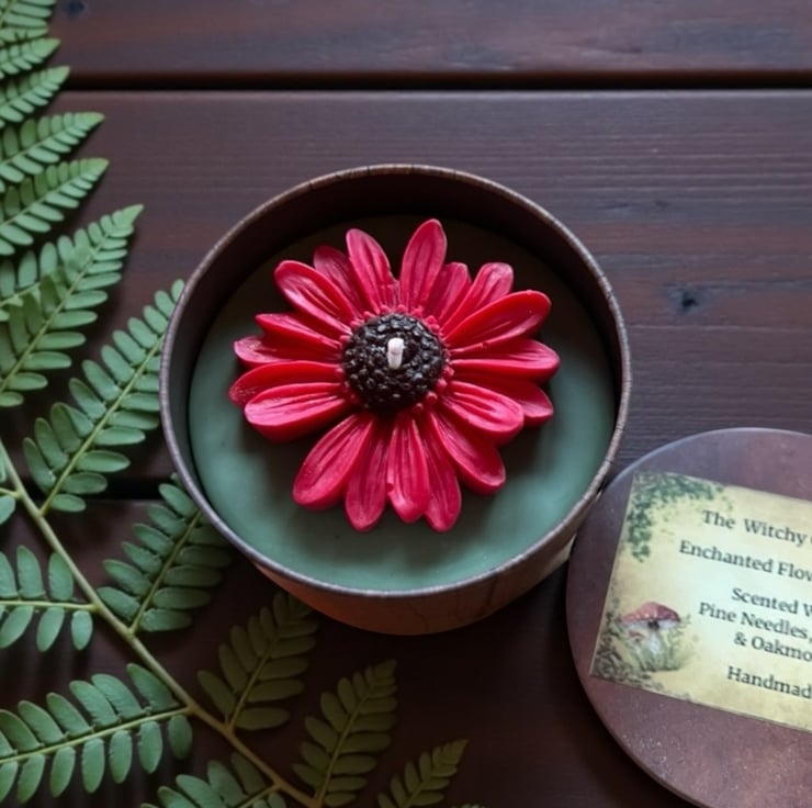 Each candle is individually poured and features a stunning red flower design that floats atop a soothing forest-green base, making it as decorative as it is aromatic.