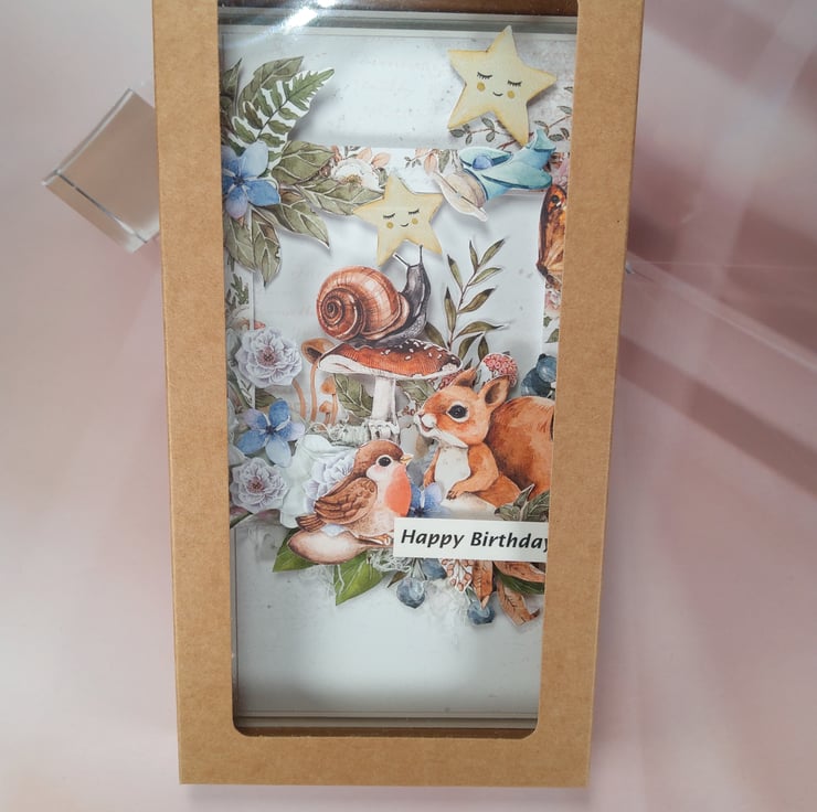 A delicate and beautifully layered handmade birthday card featuring charming woodland animals, soft florals and subtle natural details. Perfect as a unique keepsake for someone special.