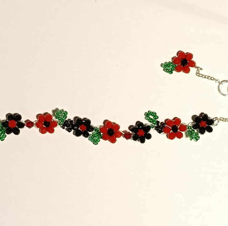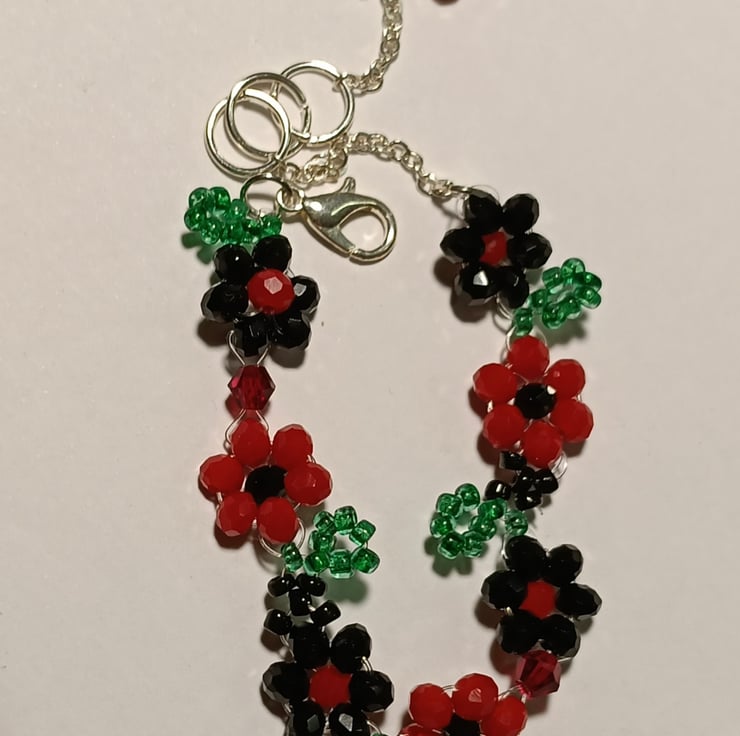I wanted to make a bracelet with a dark and villainous look to it . So I made this with red and black flowers . And dark green leaves to add a pop of colour.
