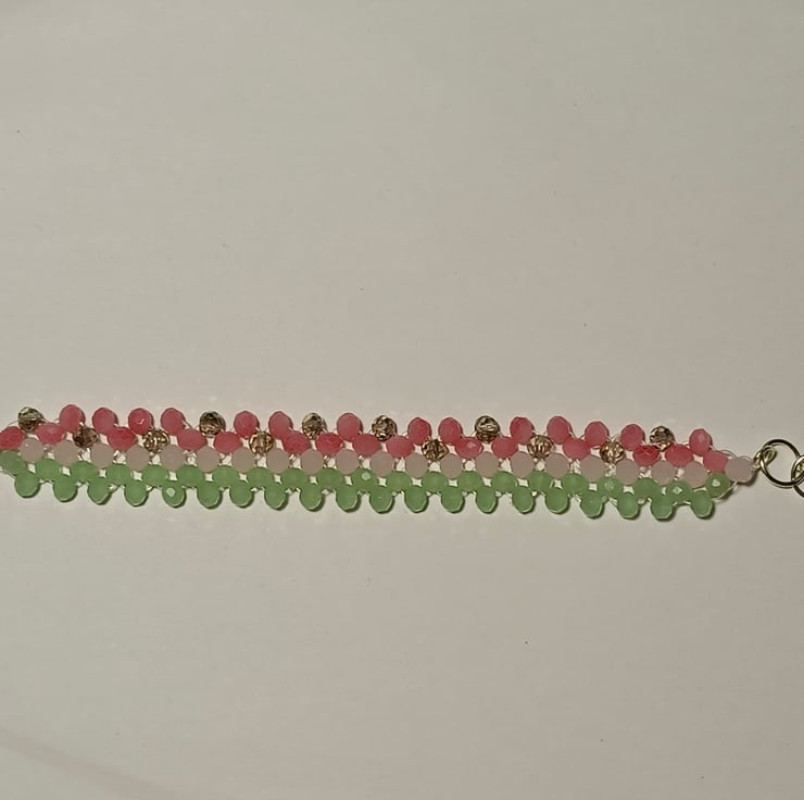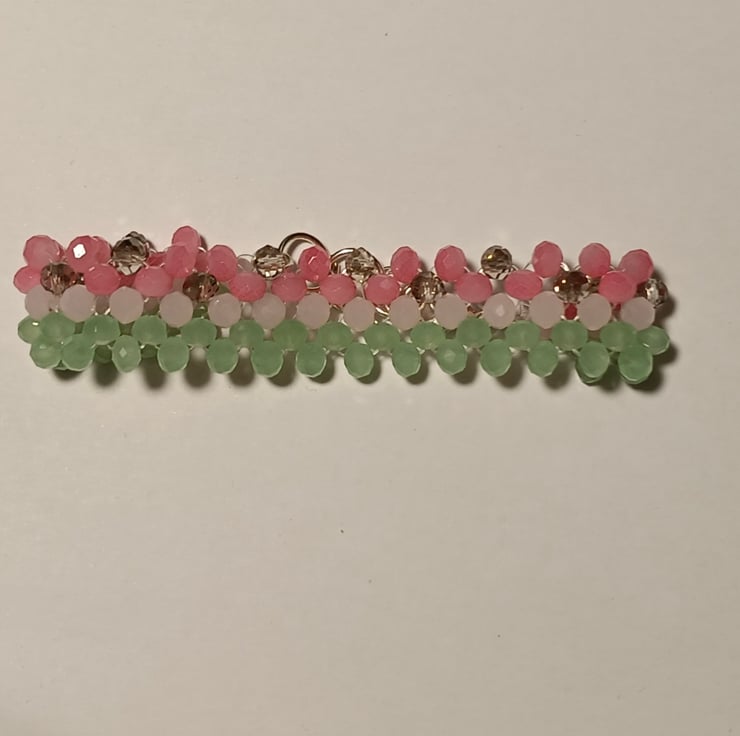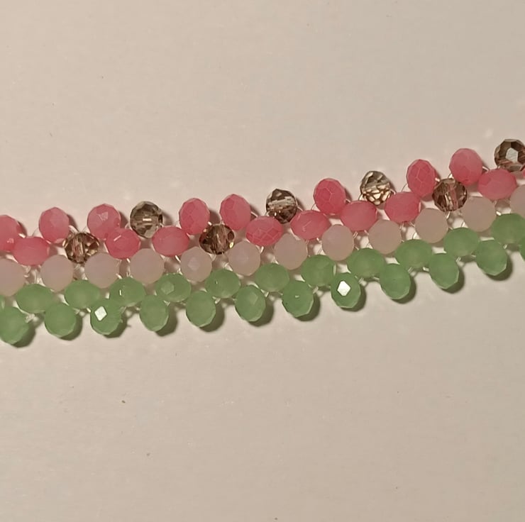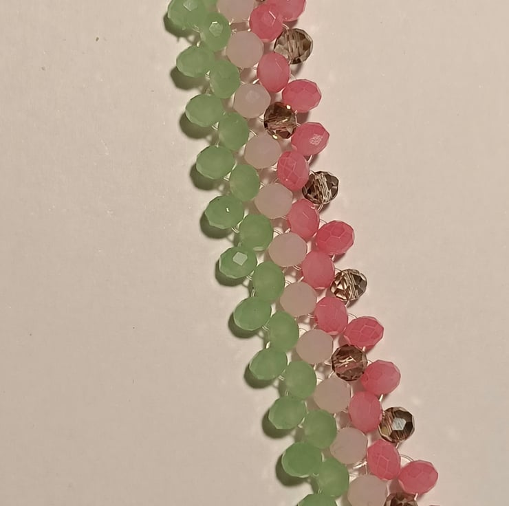 This unique piece is made with 4mm pink crystal beads, 4mm transparent grey beads, 4mm pale pink crystal beads and 4mm pale green crystal beads.