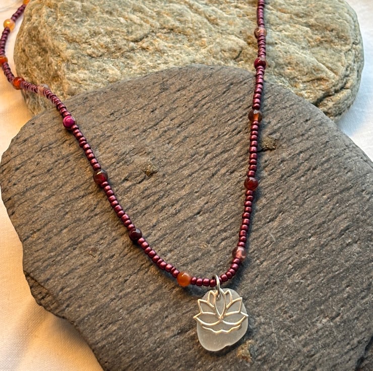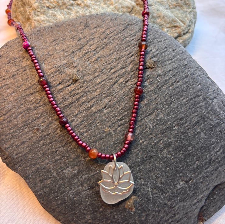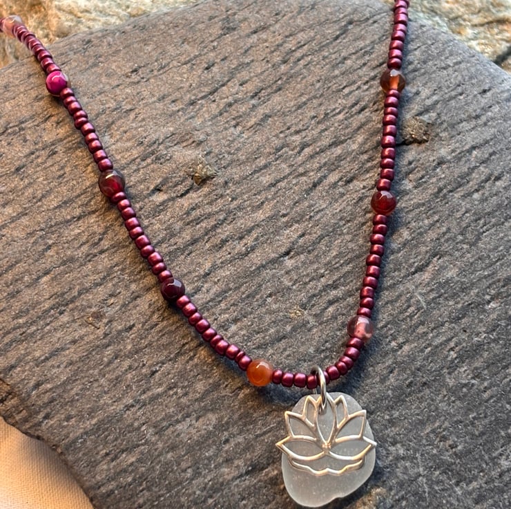 Necklace Seed beads and Agate in Burgundy with seaglass and SS Lotus Charm